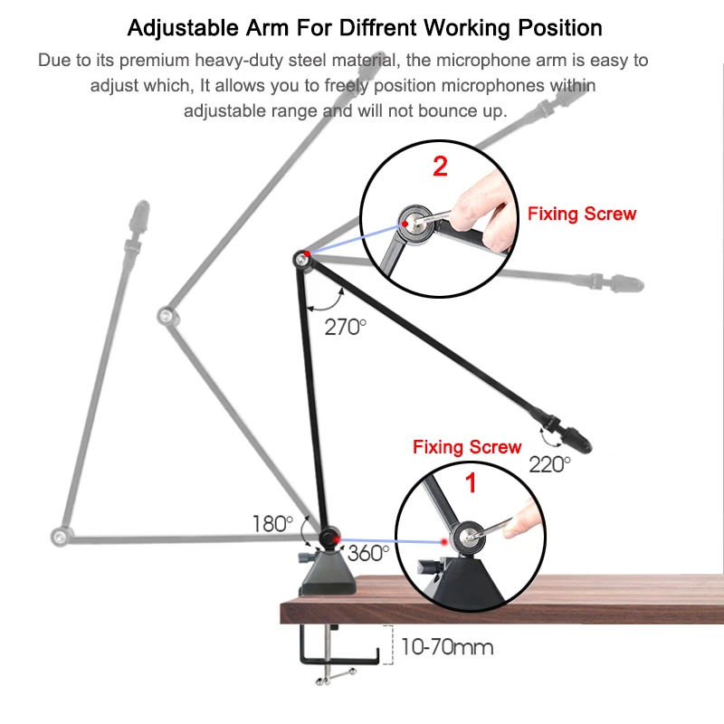 Благодаря высококачественному сверхпрочному стальному материалу, поставляется с небольшим гаечным ключом, ручные затягивающиеся фрикционные петли для гладкости, они позволяют свободно размещать микрофоны в пределах регулируемого диапазона.