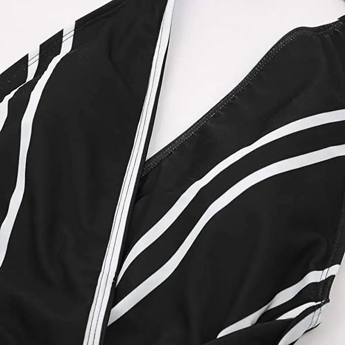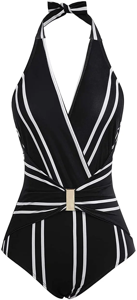 Купальный костюм с открытой спиной, лямками на шее, принтом в полоску для элегантного образа и менее показательным при намокании.