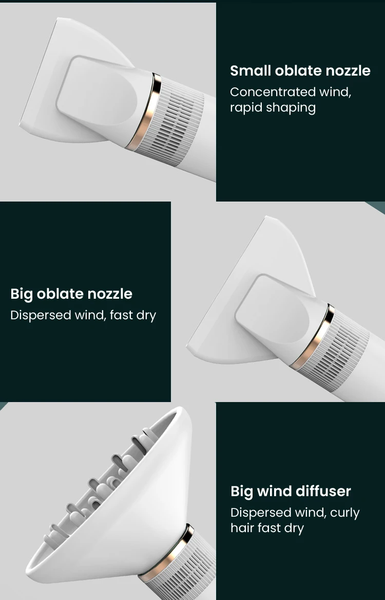 4. Профессиональные насадки для укладки волос: насадка для сбора воздуха, насадка для распыления воздуха, насадка для распыления воздуха