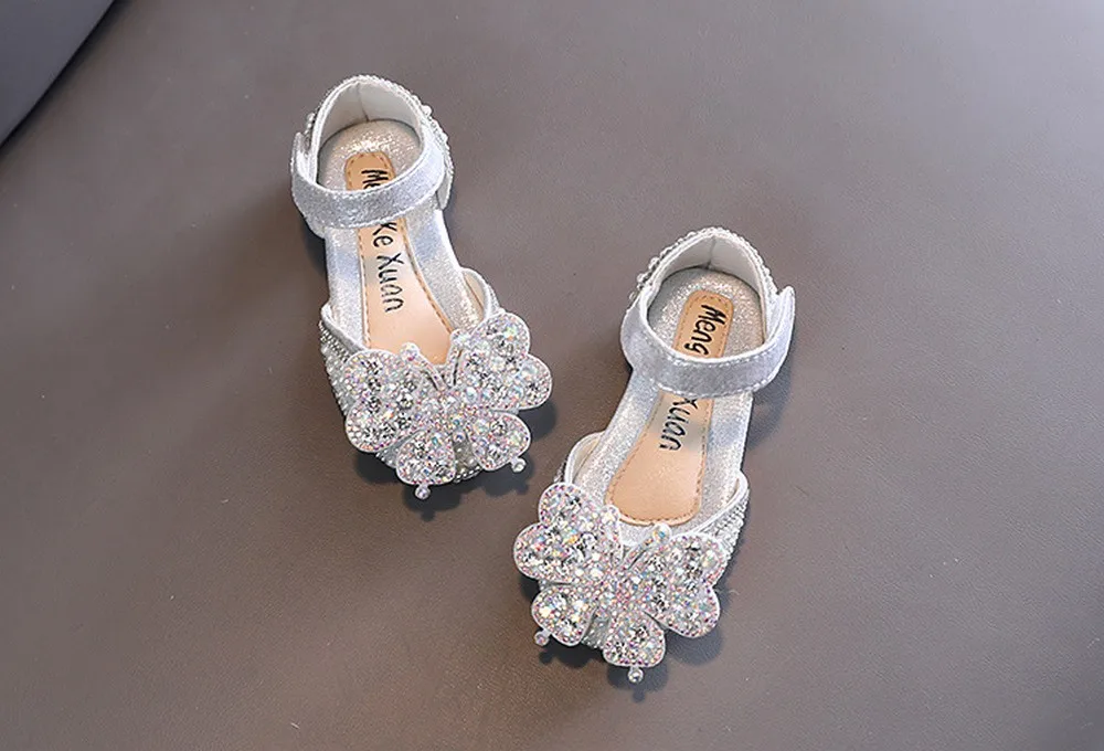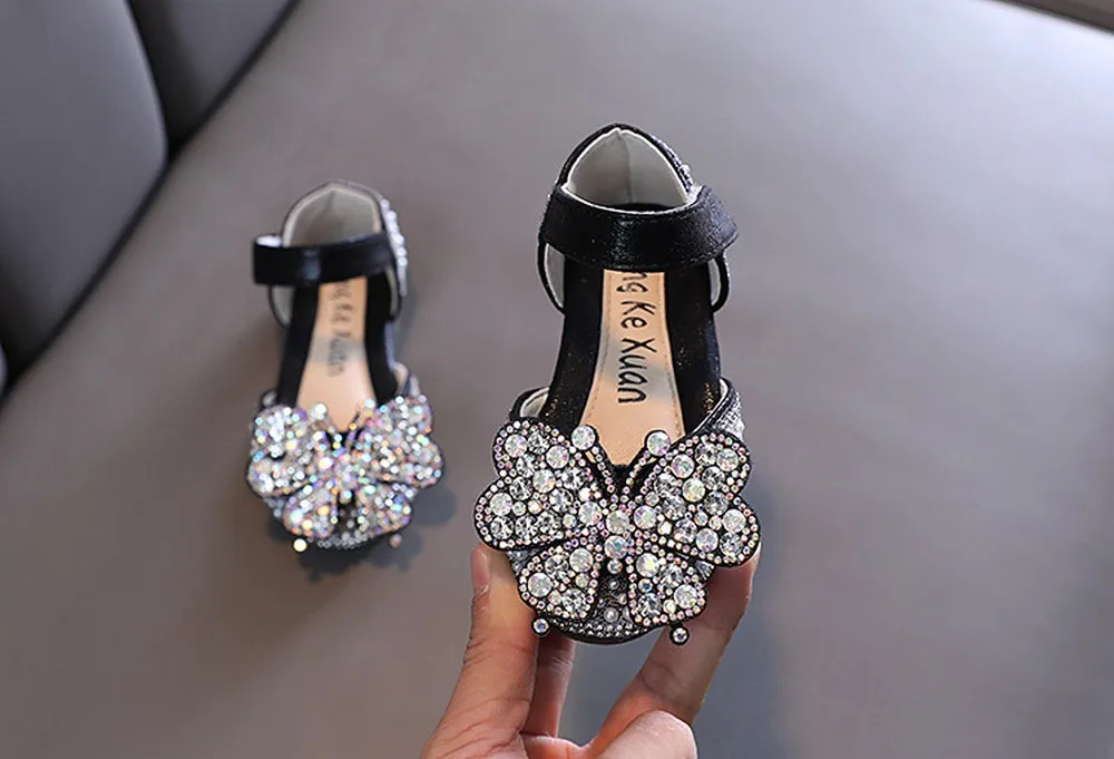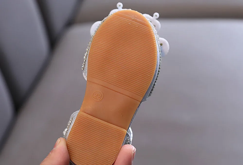 2022 новые летние детские сандалии с жемчужным бантом; Детская обувь принцессы со стразами и блестками; Модные блестящие сандалии на мягкой подошве для девочек