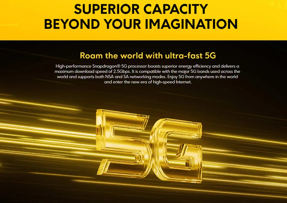 Высокопроизводительный Snapdragon®5G процессор обладает превосходной энергоэффективностью и обеспечивает максимальную скорость загрузки 2.5G bps. Он совместим с основными диапазонами 5G, используемыми по всему миру, и поддерживает сетевые режимы NSA и SA. Наслаждайтесь 5G из любой точки мира и входите в новую эру высокоскоростного Интернета.