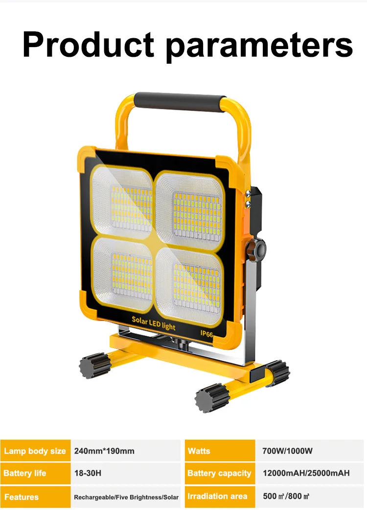 Тип лампы: солнечный наружный светильник Метод зарядки: 1000 Вт (Солнечная зарядка + USB зарядка) 100 Вт (зарядка USBC) Мощность: 1000/100 Вт Светильник источник света: 1000 Вт ()100 Вт (лампа) Цвет корпуса: как показано Размер: как показано Водонепроницаемость: IP65 Тип переключателя: ВКЛ./ВЫКЛ./Авто/Синхронизация Регулировка яркости: Да Источник питания: солнечная панель (6 в 8 Вт/6 в 10 Вт) Аккумулятор: 10000 мАч-20000 мАч Время зарядки: about6-8hours Время работы: Полная мощность, может работать в течение 10-16 часов