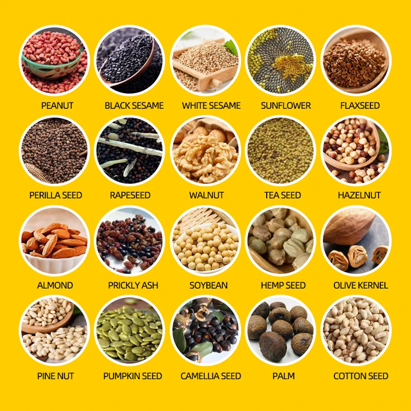 Семена хлопка, зародыши кукурузы, пищевая фиолетовая Перилла, семена льна (лен Абердин), семена травы, семена конопли, семена ятрофы, семена жожоба, семя киви, семена Моринги, семена нима, семена окры, арахис, перец (сухой), ядро кедрового ореха, семена платиклади, семена колючей золы, семена тыквы, семена шиповника, Семена сафлора, шизандра, кунжут (черный кунжут и белый кунжут), соя, семена подсолнечника, орех и орехи макадамии. Если вы хотите использовать его для других семян, пожалуйста, свяжитесь с нами.