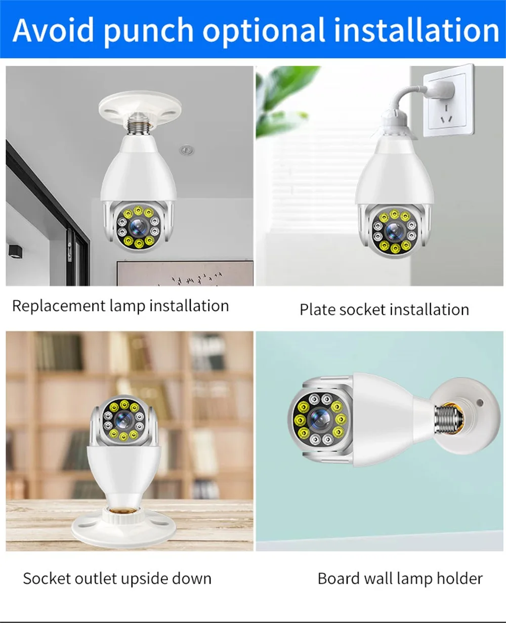 Эта домашняя камера так же проста в установке, как лампа. Работает с E27 светильник, просто нужно установить его в розетку E27 и включить питание.