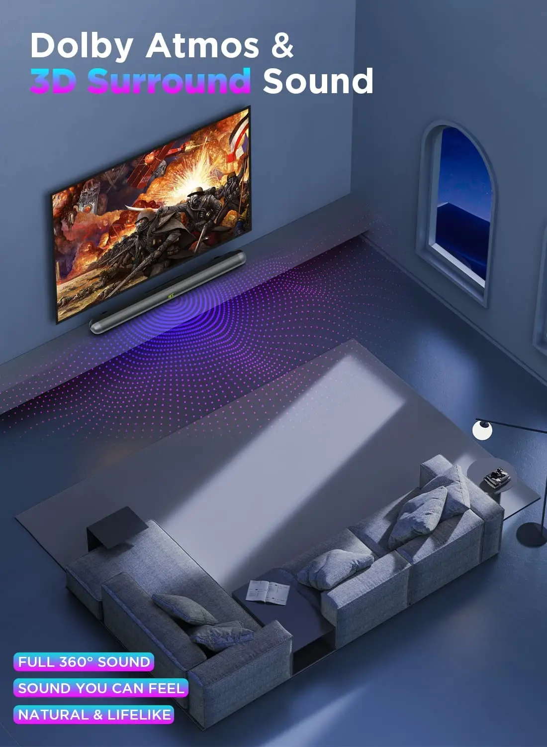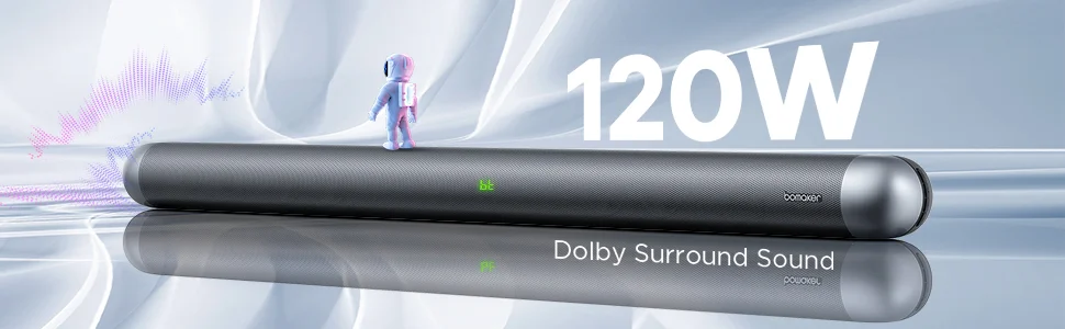 Благодаря цифровому декодированию Dolby, обработке аудиозаписей и режиму объемного звучания 3D, soundbar Bomaker TV использует алгоритмы для расширения звукового поля, чтобы обеспечить более захватывающий опыт без использования внешних динамиков.