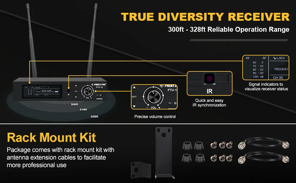 PTU-1U Беспроводная микрофонная система поставляется с антенным комплектом с удлинителями для стойки. Пользователи могут легко установить антенну спереди для лучшего приема с полным набором инструментов. УВЧ-система может произвести впечатление на любые места среднего и большого масштаба благодаря высокому качеству звука, идеально подходит для сцены, концертов, церковного культа, свадьбы, DJ gigs и мероприятий на свежем воздухе.