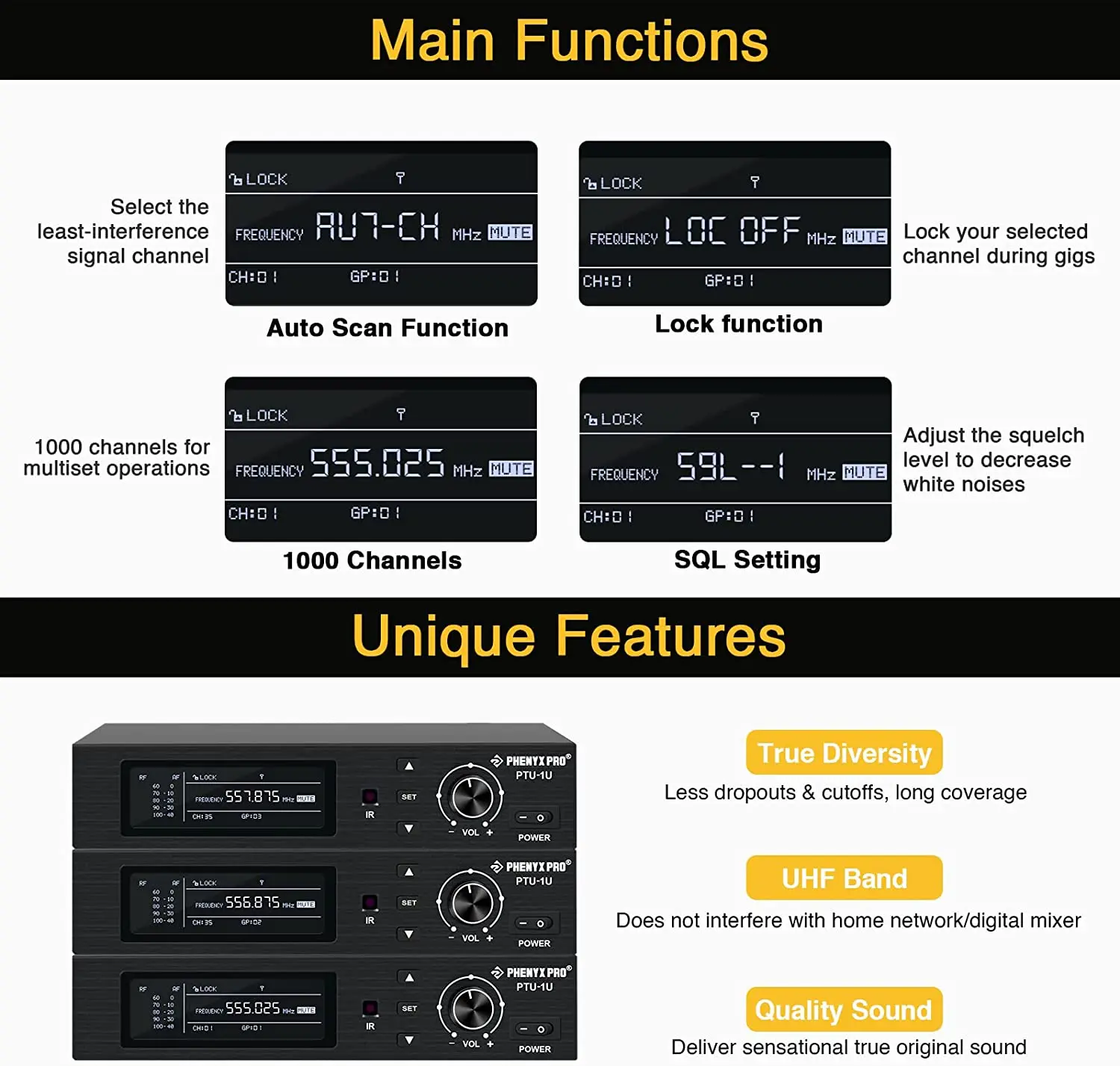 Одноканальная UHF полоса (500 - 600 МГц) Беспроводная микрофонная система с улучшенной схемой подлинного разнообразия для увеличения возможностей защиты от помех. Он обеспечивает исключительно стабильные сигналы и оригинальное воспроизведение звука. 1000 выбираемых частот позволяют выполнять множество операций и избегать помех в сложных настройках. Дальность действия 300 - 328ft линии зрения с быстрой ИК-синхронизацией