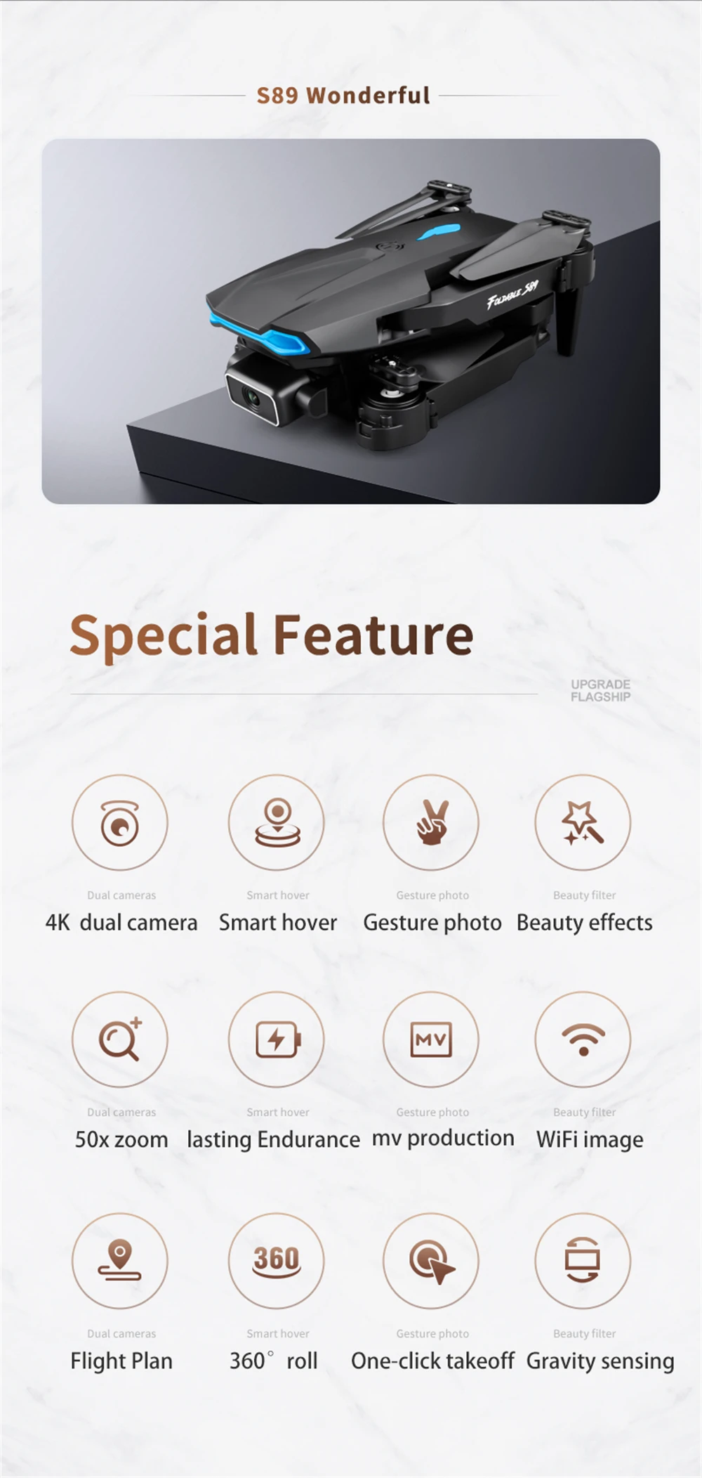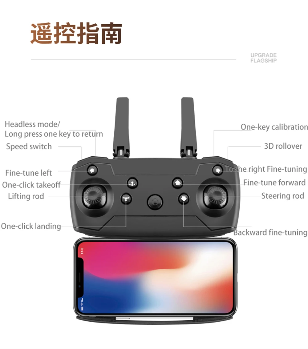 Functions: up/down, forward/backward, left/right, side flight, three-level flight speed, LED lights, headless mode, one-key automatic return, altitude hold mode, WiFi FPV, trajectory flight, Camera/video