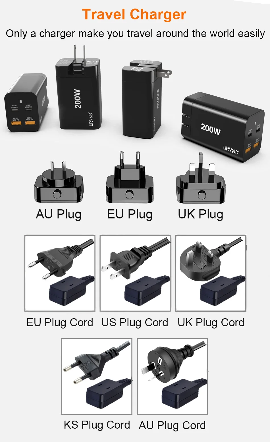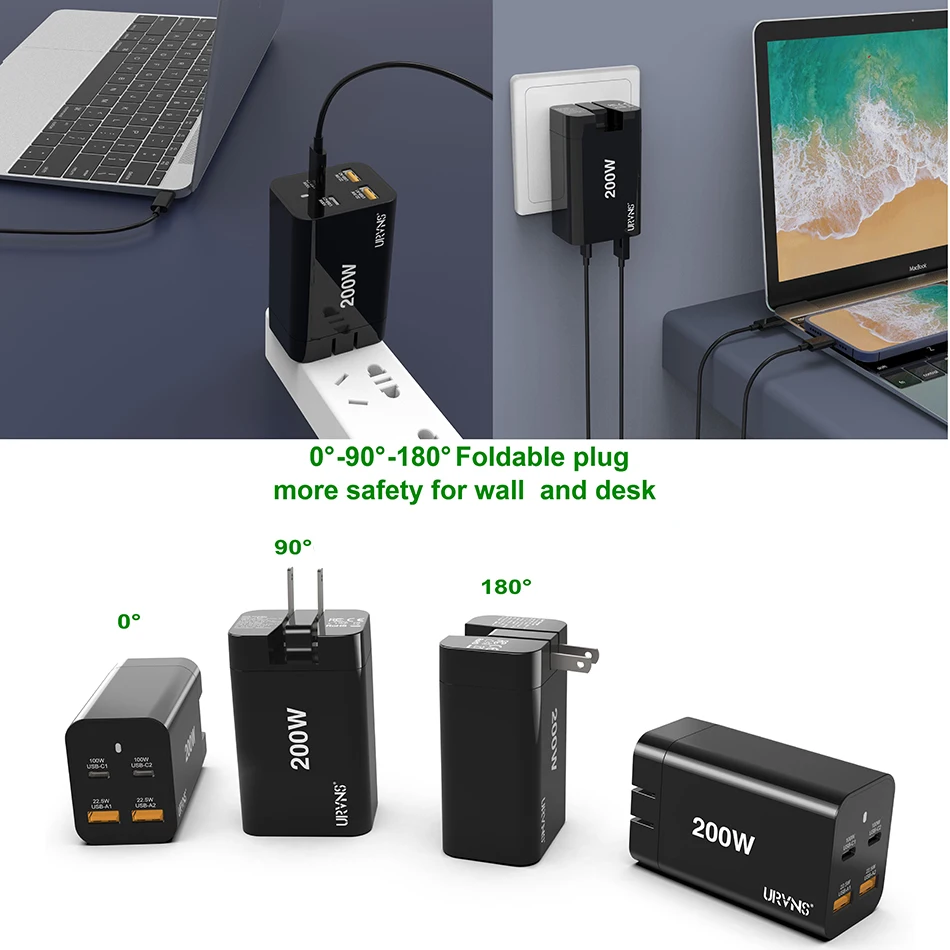 URVNS 200 Вт GaN USB C настенное зарядное устройство адаптер питания, 4 порта PD 100 Вт PPS 45 Вт QC4 SCP для ноутбуков MacBook iPhone 13 Samsung Xiaomi Dell