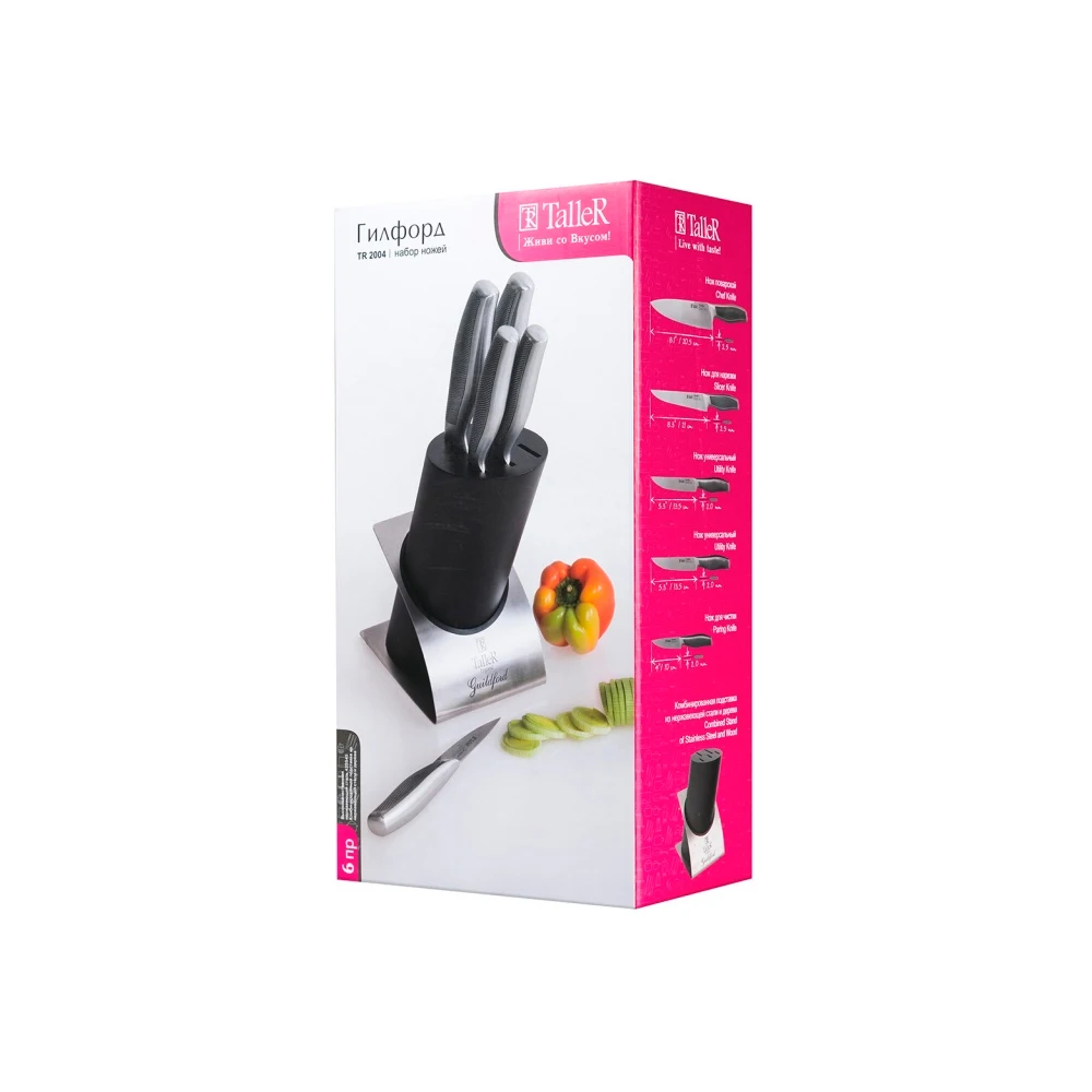Набор кухонных ножей Гилфорд – это стильный набор из 6 предметов: подставка и пять многофункциональных ножей.