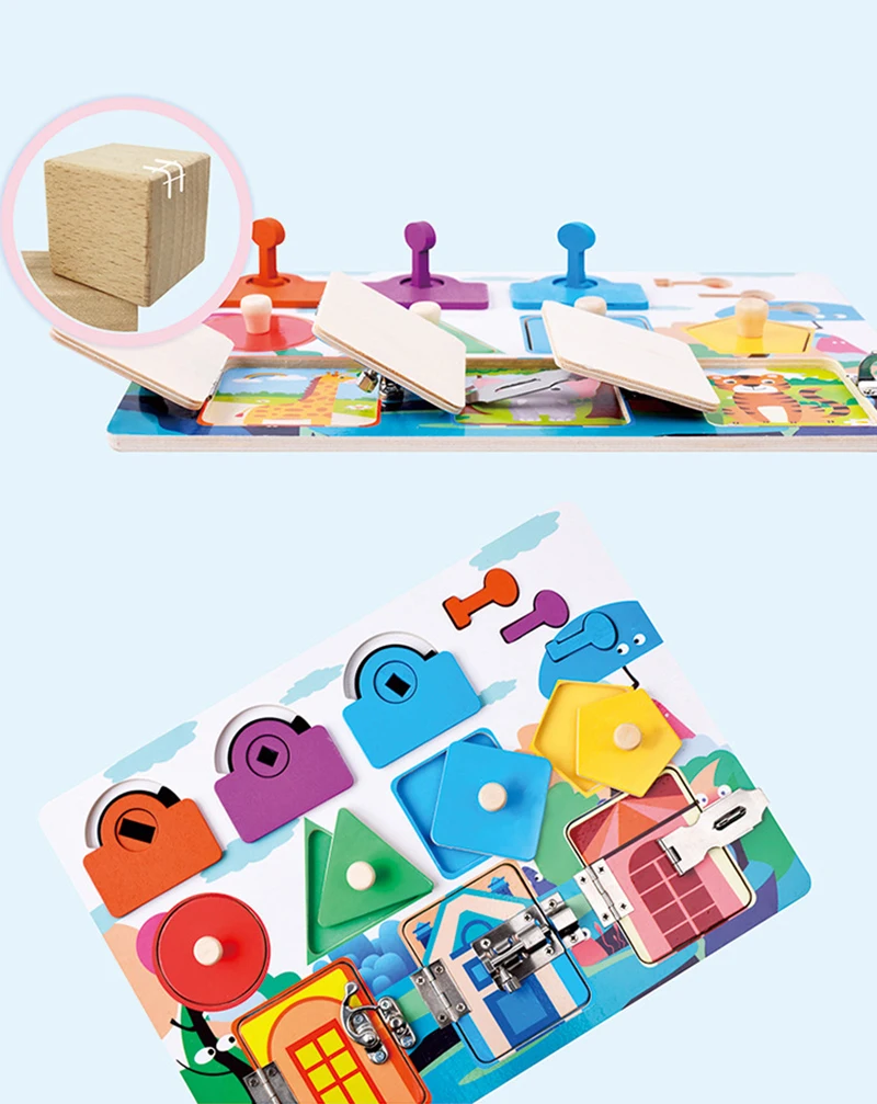 1. Эта спортивная доска имеет тему сокровищ и включает в себя 3 замки в форме сундука и 3 различных сочетающихся ключа; 4 различные формы скрепленных пазлов; 3 двери с различными защелками