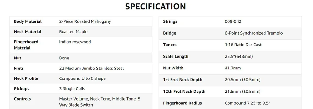 Roasted Maple Neck and Roasted Mahogany Body:Roasted maple neck provides excellent stability and gorgeous caramel finish.The mahogany wood used for the body was also roasted for stronger mids and slightly lighter weight.