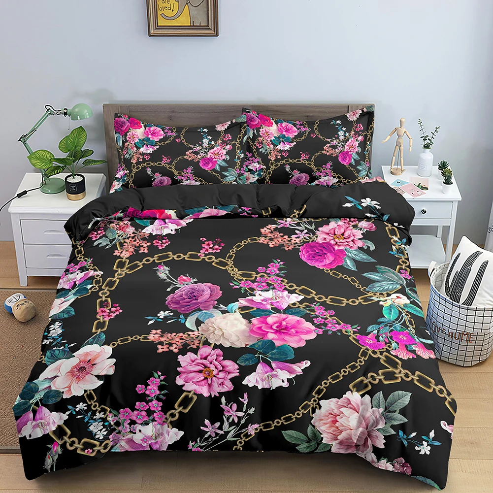 3D Floral Duvet Cover Double 210x210 Bedding Set 2/3pcs Quilt Cover With Zipper Closure King Size Gold Chain Comforter Cover