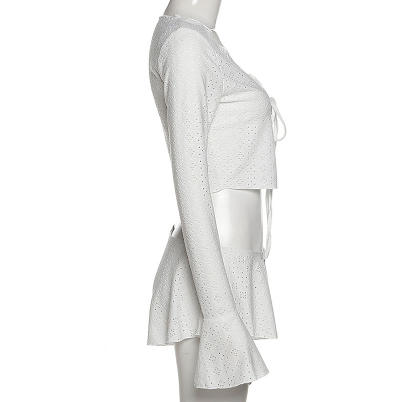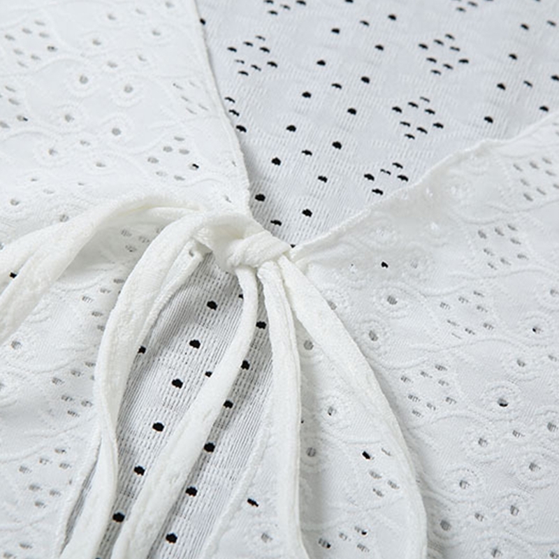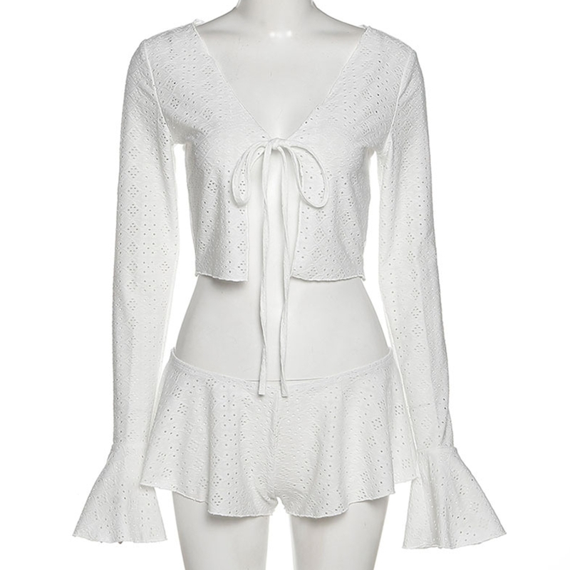 Верх: расклешенные длинные рукава, гофрированные манжеты, открытая спереди, глубокий v-образный вырез, шнуровка спереди, обрезанная длина.