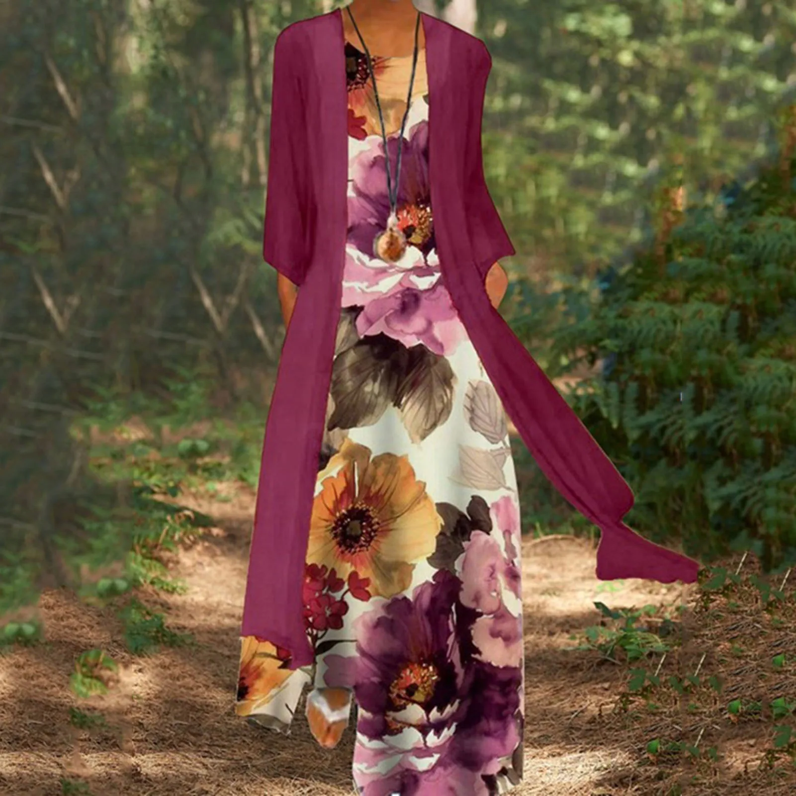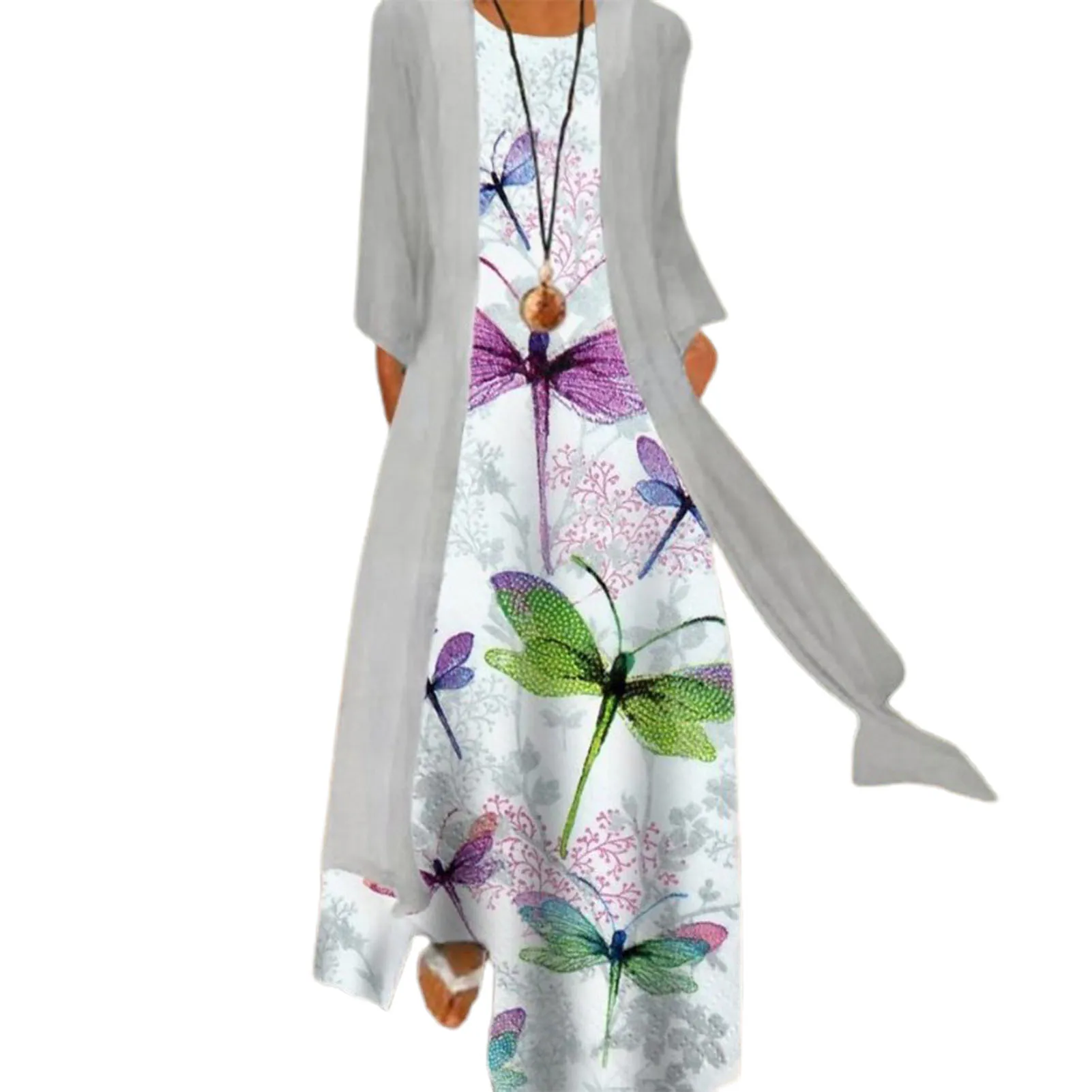 Комплект из 2 предметов, платье с цветочным принтом, женское платье макси без рукавов, Свободный кардиган с длинными рукавами, верхняя одежда, комплект из двух предметов, женское платье, костюм