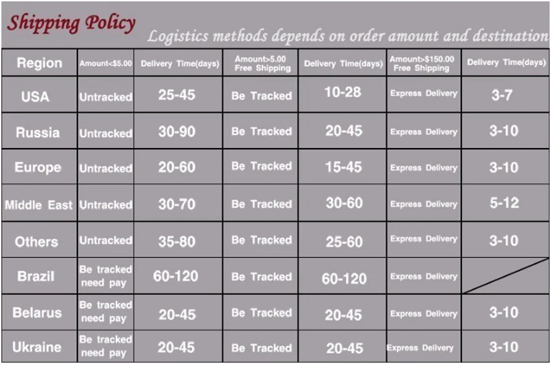 Время доставки зависит от пункта назначения и других факторов. Пожалуйста, поймите время доставки дольше, чем ваш местный продавец. Однако иногда возможны некоторые задержки в таможенном оформлении или доставке.