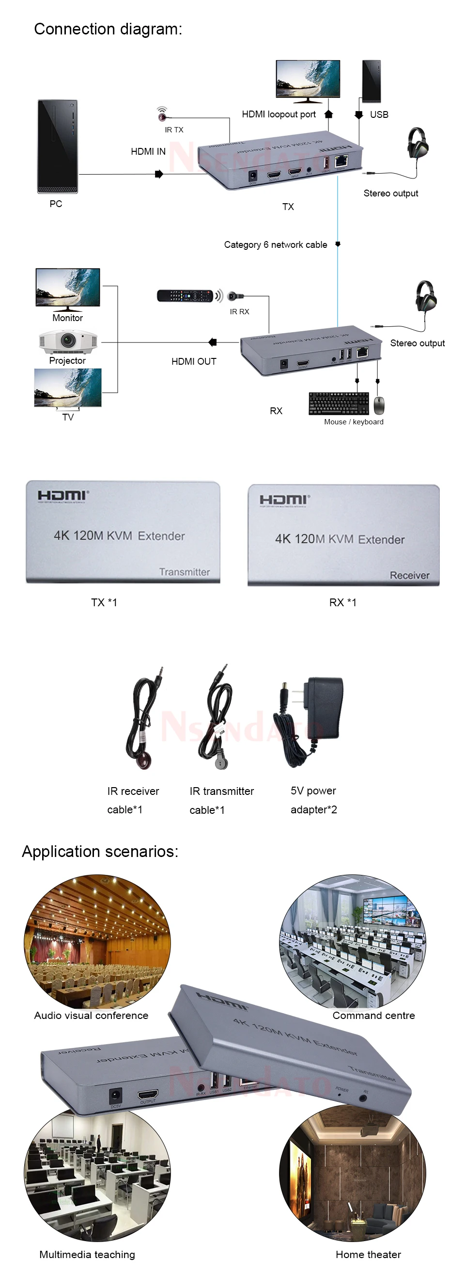 Nsendato HDMI Over Ethernet is based on TCP/IP standard. It transmit your HD display with the high resolutions up to 120 meters away from your HDMI source by using one CAT5e/6 cable. With the advantage of TCP/IP standard, you can extend your HD video to multiple displays by using an Ethernet Switch, providing greater flexibility and options when integrating several home theater components.