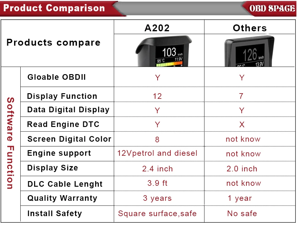 A202 может отображать и контролировать напряжение аккумуляторной батареи транспортного средства, напряжение зарядки генератора, предлагая сигнал о превышении скорости транспортного средства, сигнал тревоги с высокой температурой двигателя, мониторинг и другие функции.