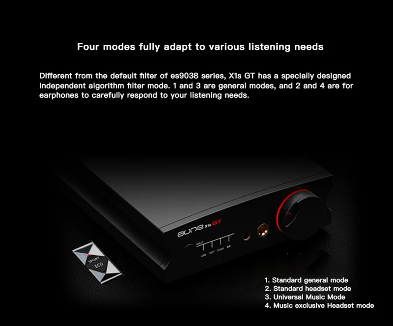 Четыре различных режима привода/цифровые фильтры:-Вместо обычных DAC фильтров, Aune X1s GT имеет собственные специально разработанные режимы фильтров с саморазработанным алгоритмом Aune. Они оснащены двумя режимами для общего использования и двумя специально для наушников.