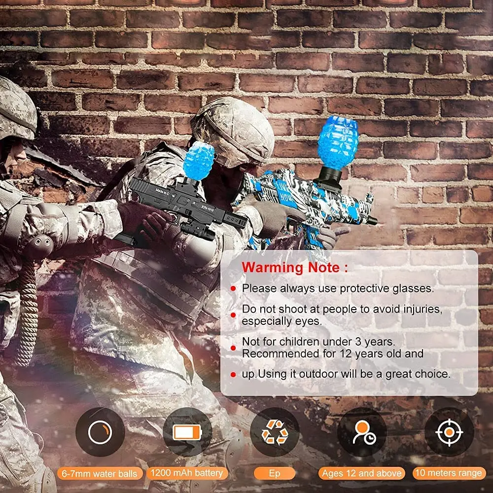 [Лучшие аксессуары для игр на улице выбор]: гель мяч Blaster работает надежно и сильнее на 7,4 V 1200mAh литий-ионная аккумуляторная батарея. Он может снимать 3-5 капель водяных бусин в секунду с диапазоном около 32 футов. Идеальный бластер для любого новичка или опытного игрока. Этот гелиевый бальный бластер является фаворитом всех игр для съемки на открытом воздухе для детей и взрослых. Это отличный способ развлекать, особенно для групповых игр.