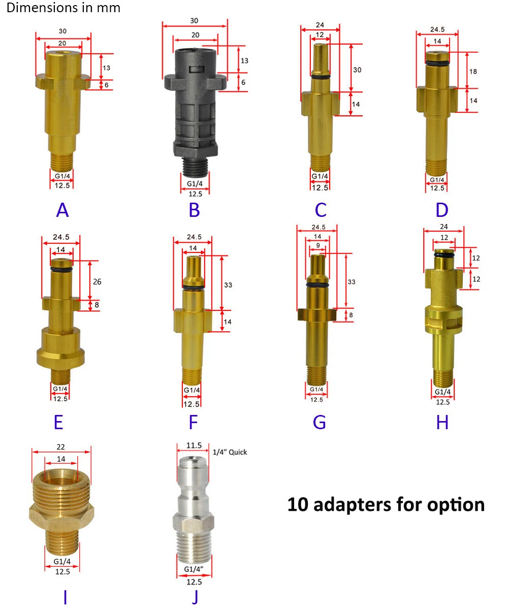 Выберите подходящий адаптер для мойки под давлением. Пожалуйста, проверьте размер адаптера и убедитесь, что он подходит для вашей машины. Мы не несем никакой ответственности за несовместимость адаптера. Если вы не уверены, пожалуйста, свяжитесь с нами и отправьте нам фотографию вашего пистолета и копья, мы поможем выбрать подходящий адаптер.