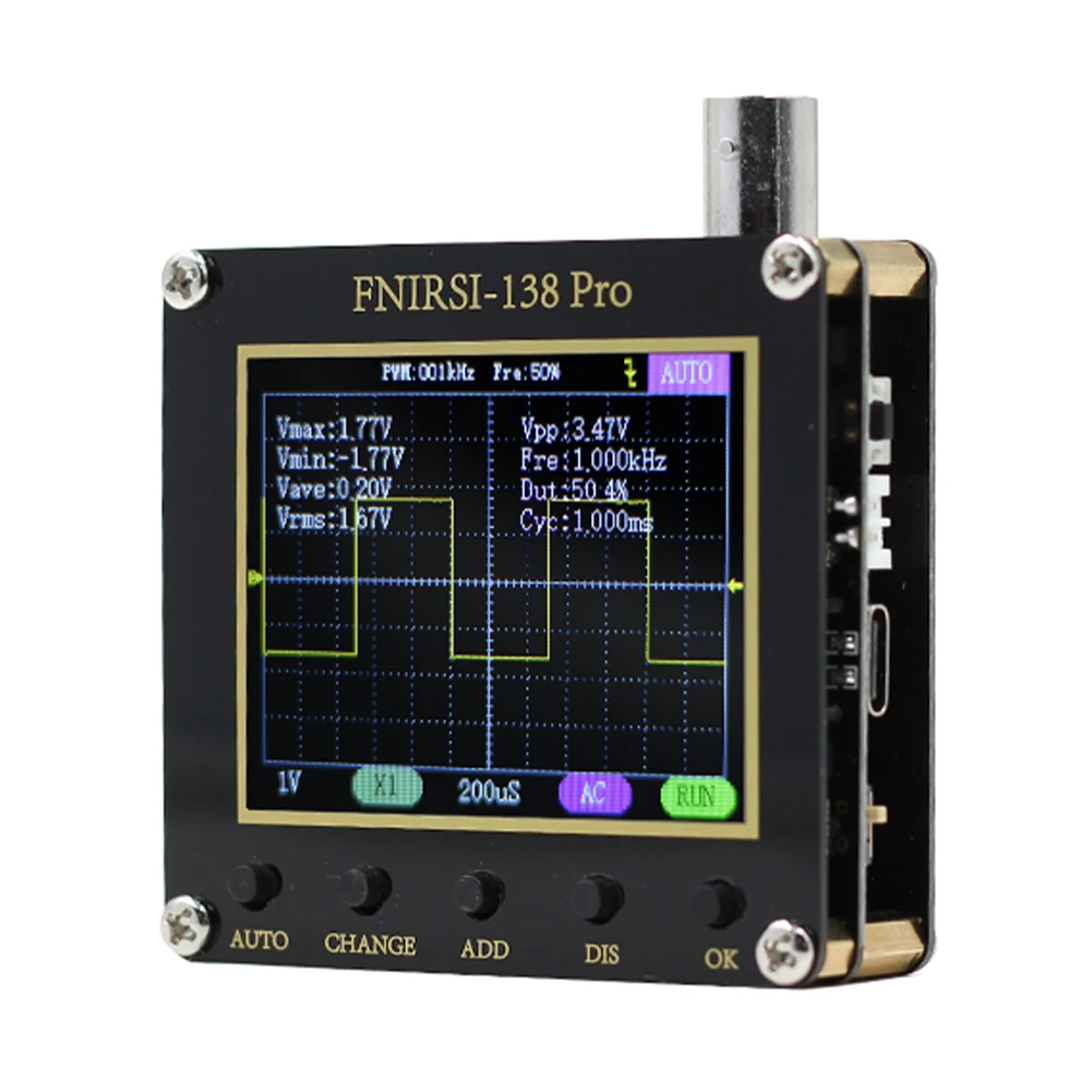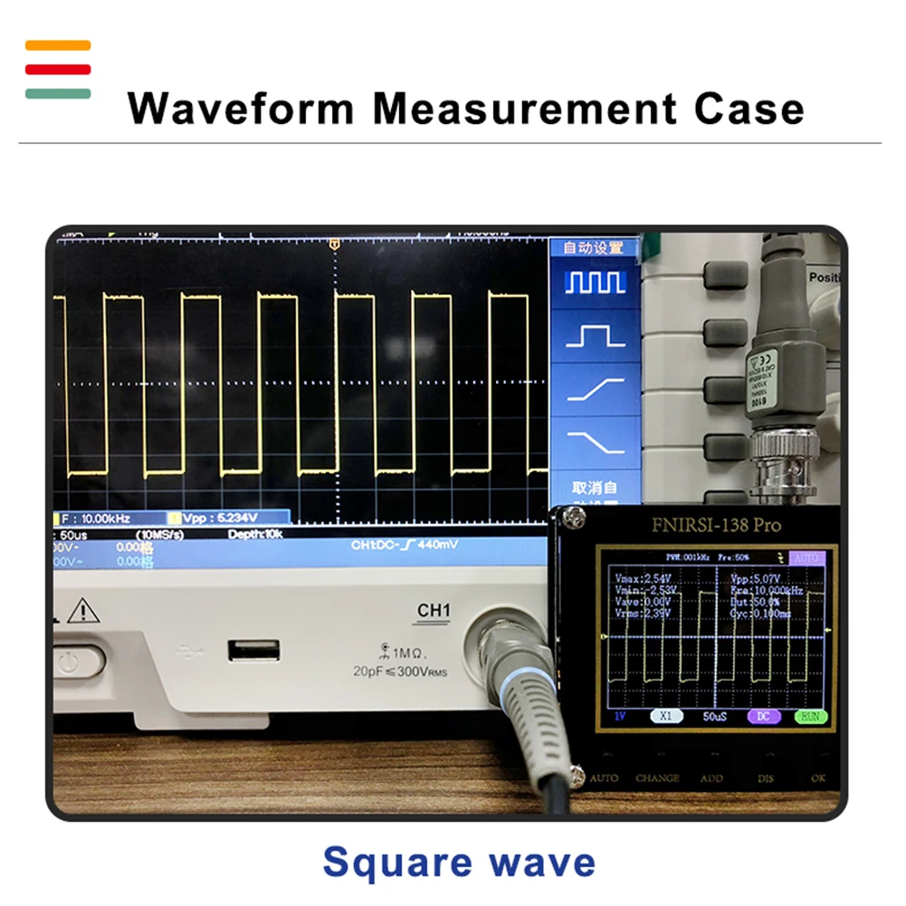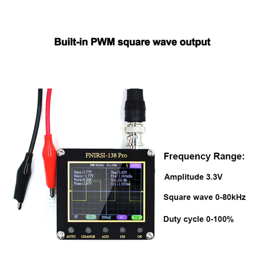 * 4. PWM квадратный волновой выход: осциллограф имеет PWM квадратный волновой выходной функции, частотный диапазон 0-80 кГц, рабочий цикл 0-100%.