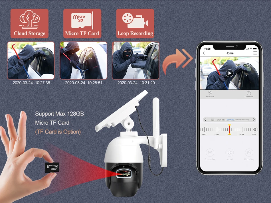 You can also use max 128G TF card to store and replay videos recorded by this outdoor security camera.
