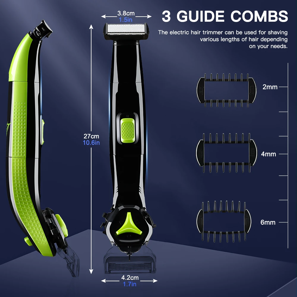 Триммер для волос на теле оснащен 4 типами гребней (1 мм/2 мм/4 мм/6 мм), которые могут легко обрезать волосы на теле, такие как волосы на груди, волосы на подмышках, волосы на ногах, волосы на руках и другие волосы на теле.