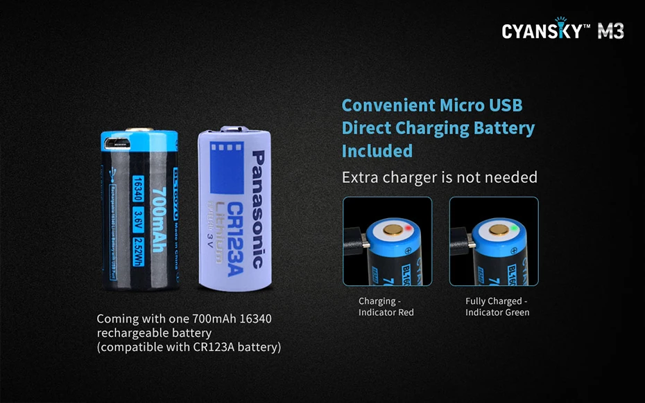 Фонарик M3 поставляется с аккумулятором, перезаряжаемым с портом Micro-USB, и вы можете выбрать совместимый аккумулятор CR123A.