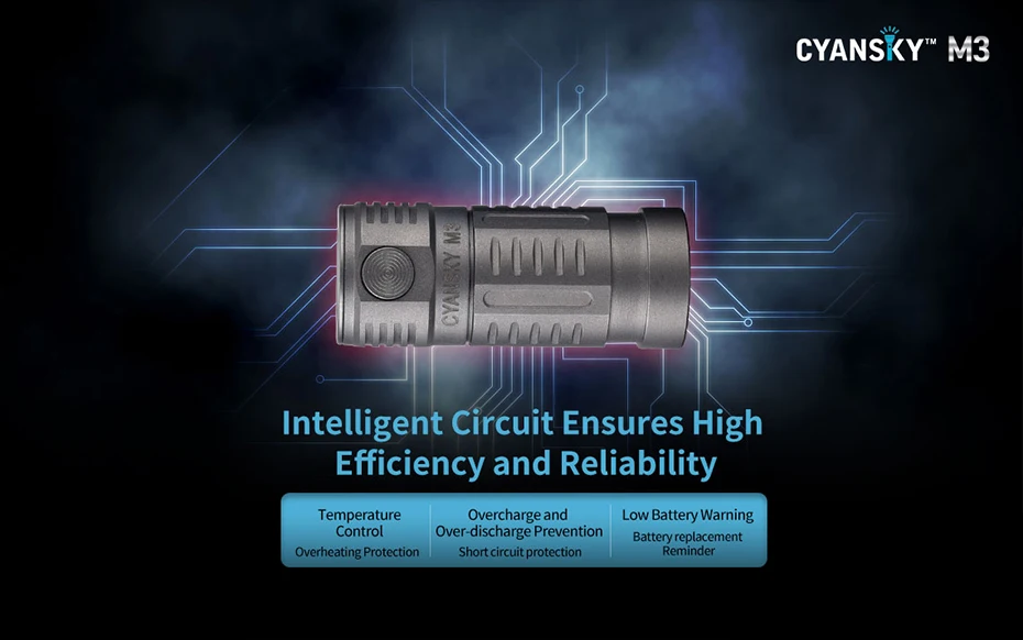 Интеллектуальная конструкция цепи обеспечивает высокую эффективность и надежность фонарика M3, от управления режимом освещения, контроля температуры, защиты зарядки и предупреждения о низком заряде батареи.