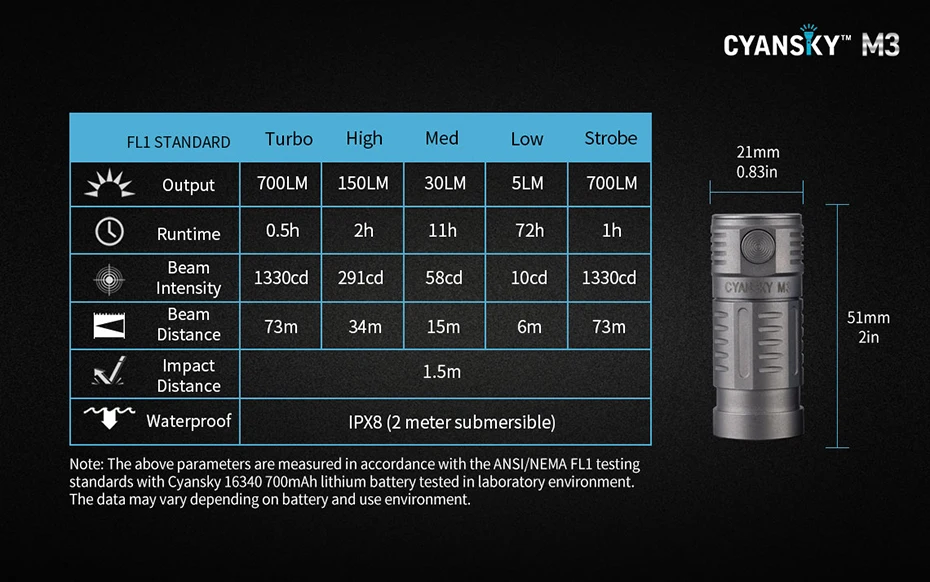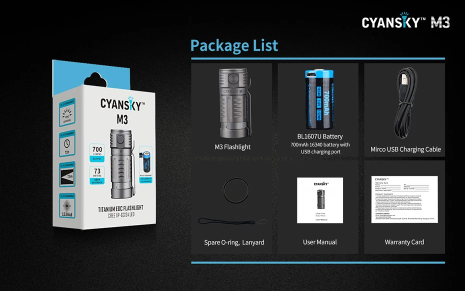 Полностью соответствует стандарту ANSI FL1, Cyansky M3 titanium flashlight Beam с высоким выходом и дальним диапазоном. Детальные возможности и выступления следующие.
