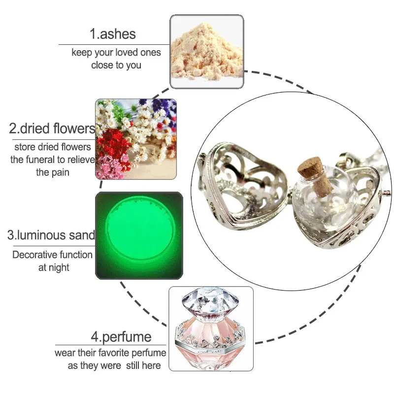 You can open it and holds a Small Amount of Dried Flowers, Dirt, Special Messages, Hair, Perfume&Oils, Cremains & Ashes.