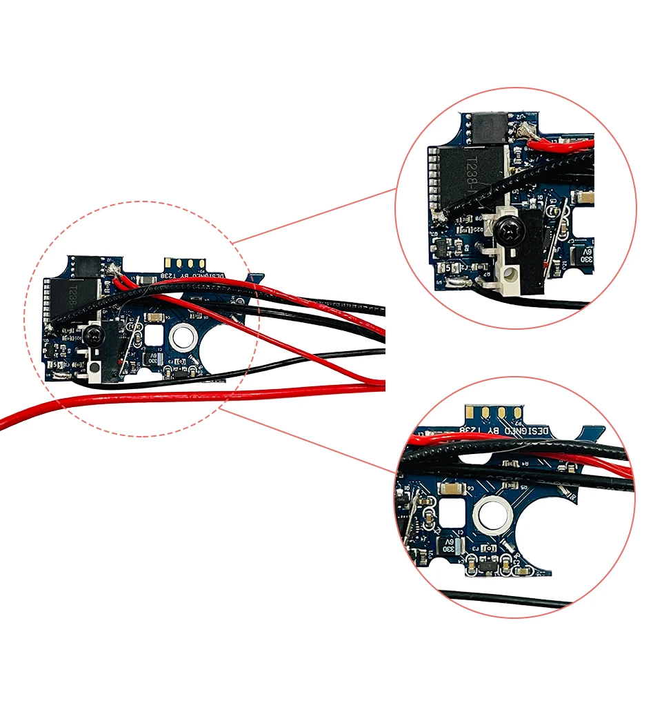 T238 digital trigger unit is a programmable MOSFET which is specially designed for AIRSOFT and gel ball version Gearbox V2 . With high speed processor and 2 high power MOSFET chips, this system has many functions, such asbinary trigger, auto-loading function for gel ball magazine, over heat protection and so on. Besides, it also has the functions of gearbox block-up protection. It can effectively improve the stability, shooting speed and response speed of gearbox. The module uses a maximum of 11.1V batteries. Soldering and wiring are required.