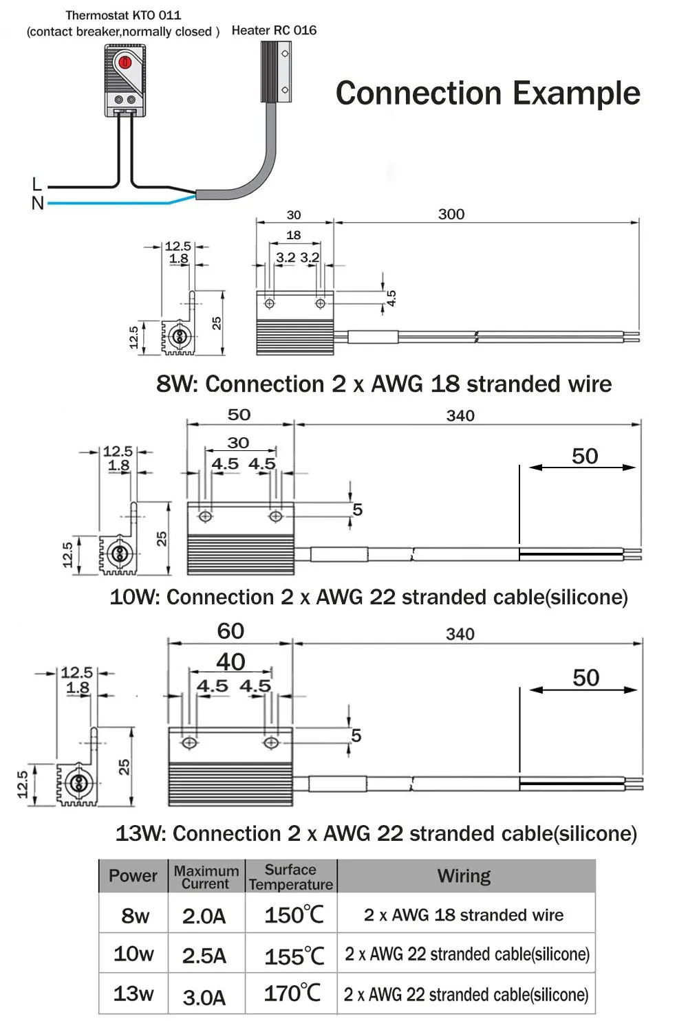 10 Вт2,5А 155 °C 2 x AWG 22 обшитый кабель (силикон) 30 г