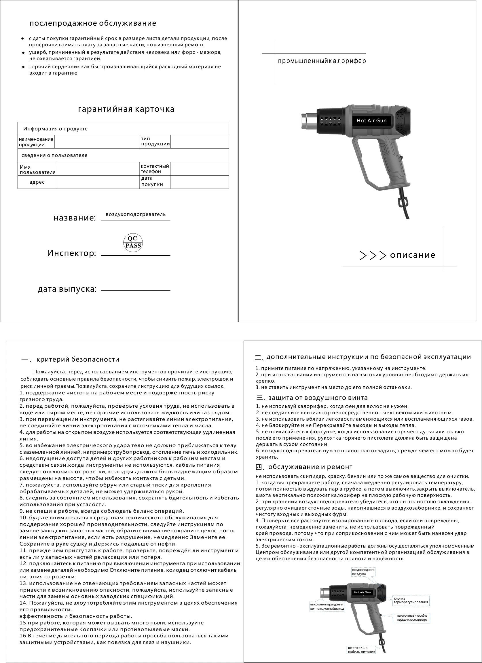 ② Когда используется пистолет горячего воздуха или только после использования, не прикасайтесь к соплу, чтобы избежать ожогов.