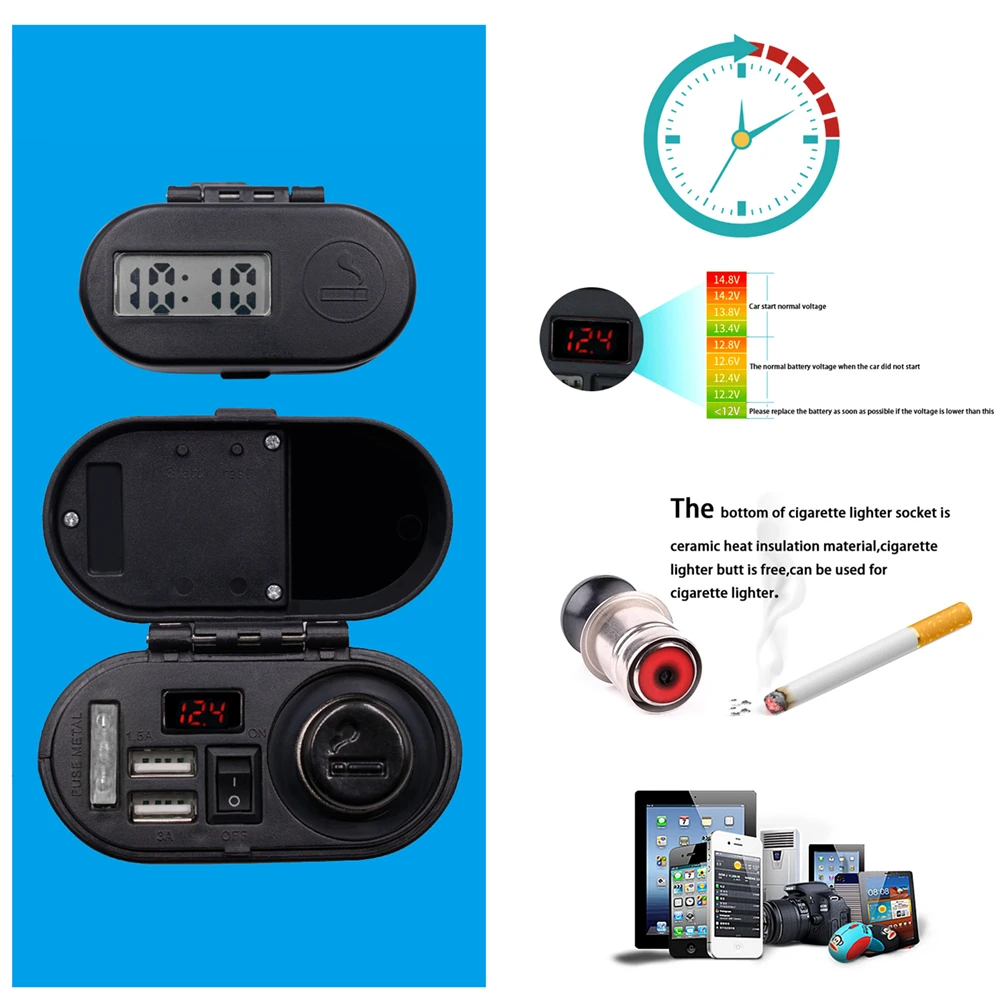 [2] продукт использует двойные usb-зарядные устройства 3A, которые могут поставлять питание на мобильные телефоны, планшеты, GPS и т. д., с очень мощными функциями. Часы, ездить безопаснее