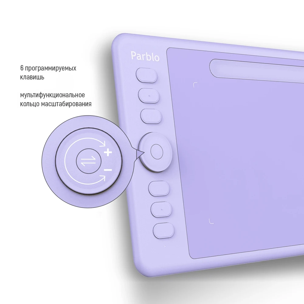 Планшет обладает 6 программируемыми клавишами и сенсорным кольцом, отвечающее за масштабирование. Используя данные функции вы с легкостью настроите свой рабочий процесс и ускорите свои результаты в освоении искусства.