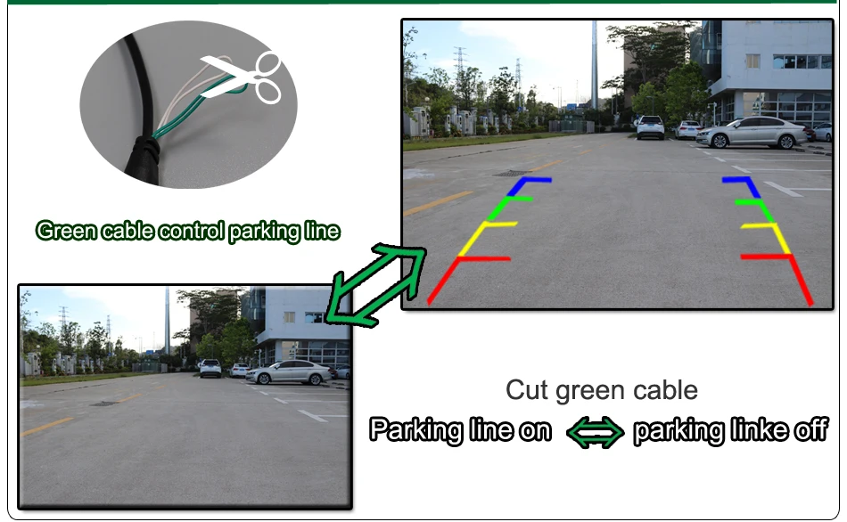 Камера с парковочной линией/камерой не отображает линию парковки, вы можете отрезать зеленый кабель, затем повторно подключить блок питания камеры, что может изменить линию парковки.
