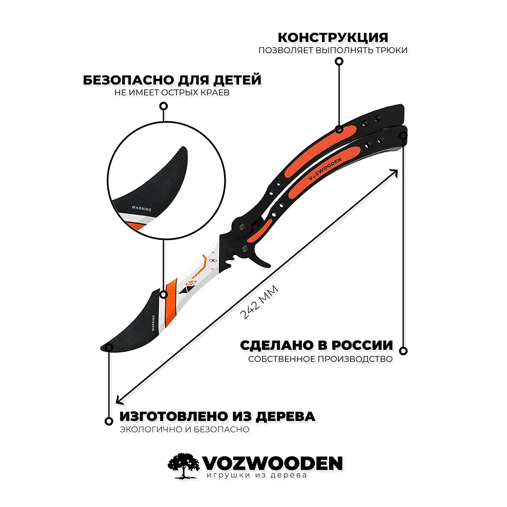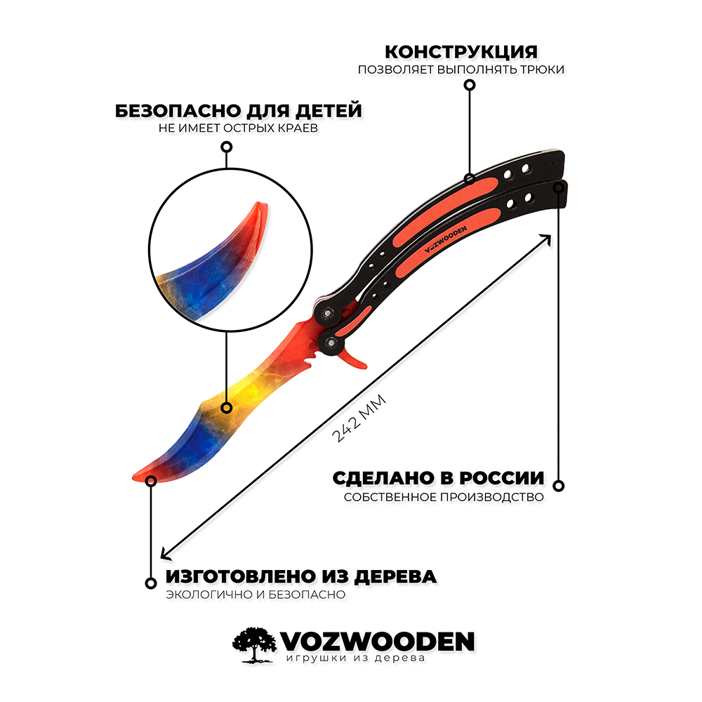 Наши ножи выполнены из настоящего дерева, экологически чистых материалов. Оружие имеет максимальную детализацию и очень похоже на настоящее, но в своем безопасном варианте. Качество нашей печати позволяет делать идеально насыщенные и стойкие цвета.