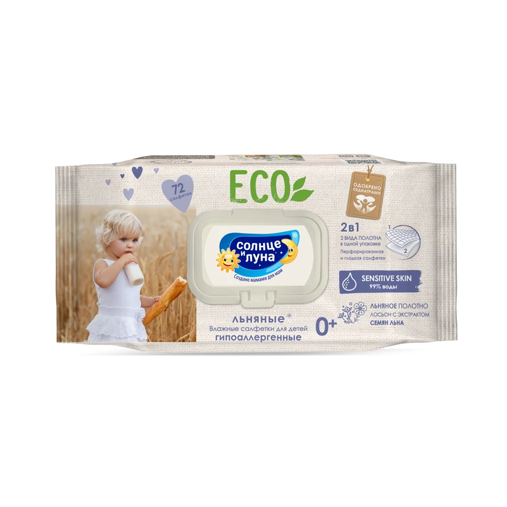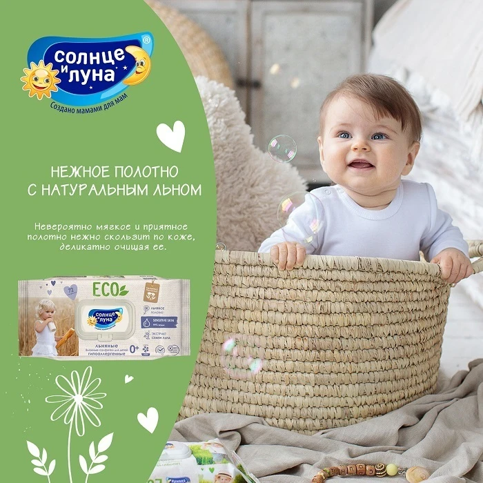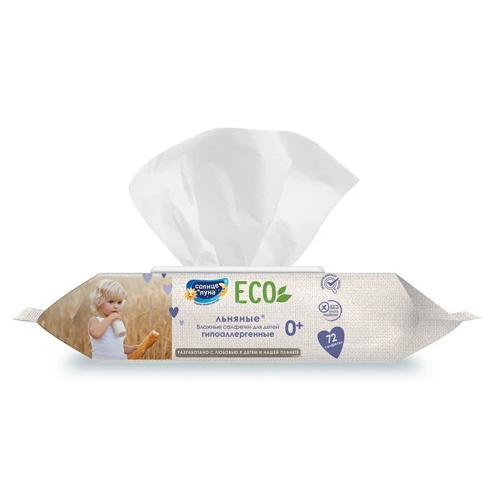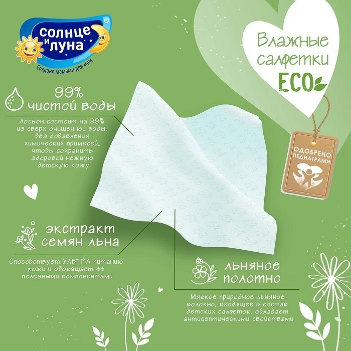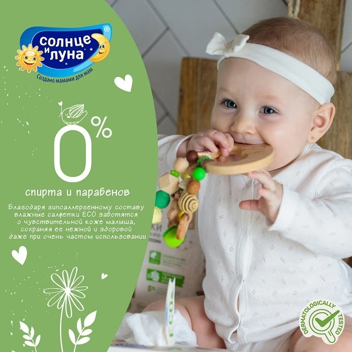 Линейка влажных салфеток «ЕСО» изготовлена только из натуральных и гипоаллергенных волокон, чтобы сохранить здоровой чувствительную детскую кожу.