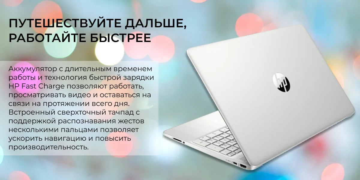 Аккумулятор с длительным временем работы и технология быстрой зарядки HP Fast Charge позволяют работать, просматривать видео и оставаться на связи на протяжении всего дня. Встроенный сверхточный тачпад с поддержкой распознавания жестов несколькими пальцами позволяет ускорить навигацию и повысить производительность.