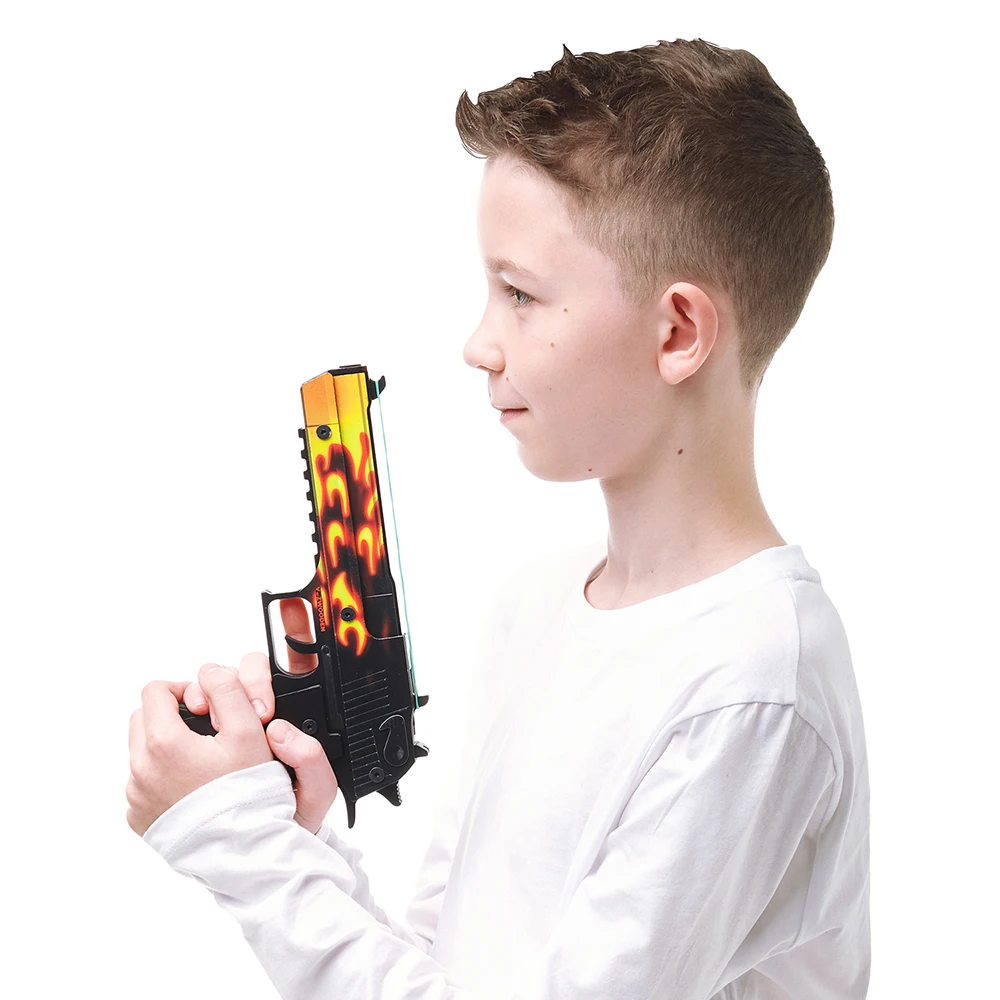 Этот резинкострел, как и оригинал, выполнен из очень живучих и качественных материалов. Основу составляет первоклассная березовая фанера, которая достойно справляется с любыми испытаниями. Конечно если вы хотите, чтобы этот служил вам годами, лучше не кидать его в стену или в воду, а также беречь от перепадов температур.