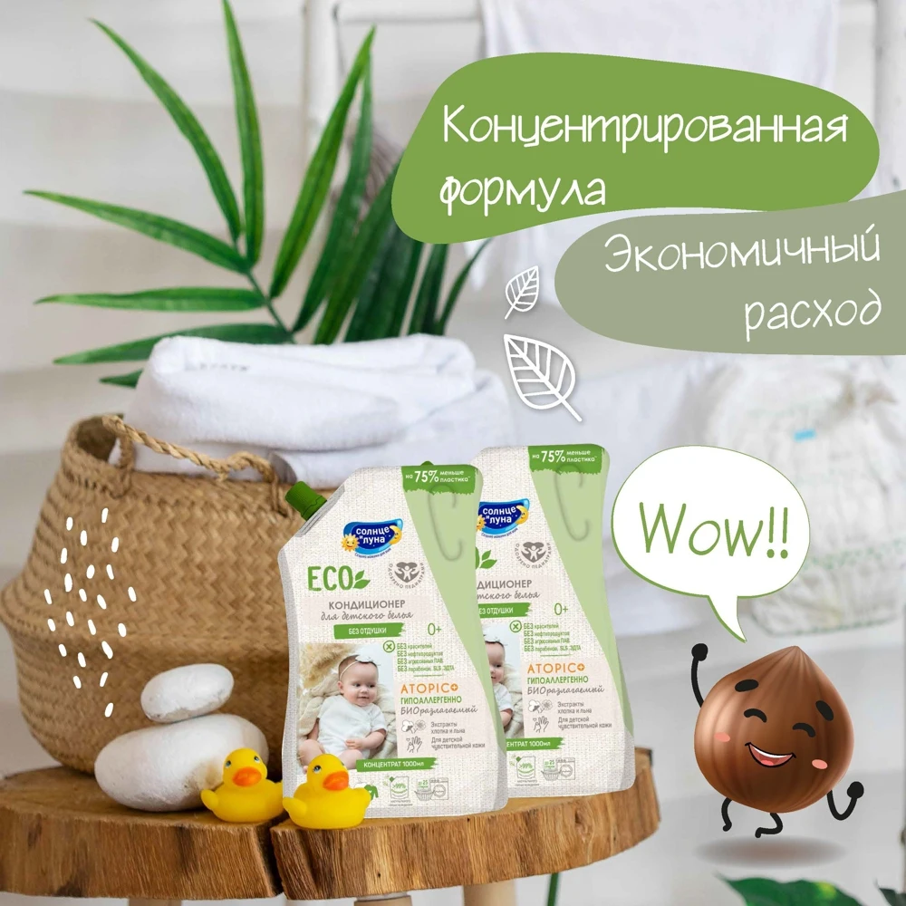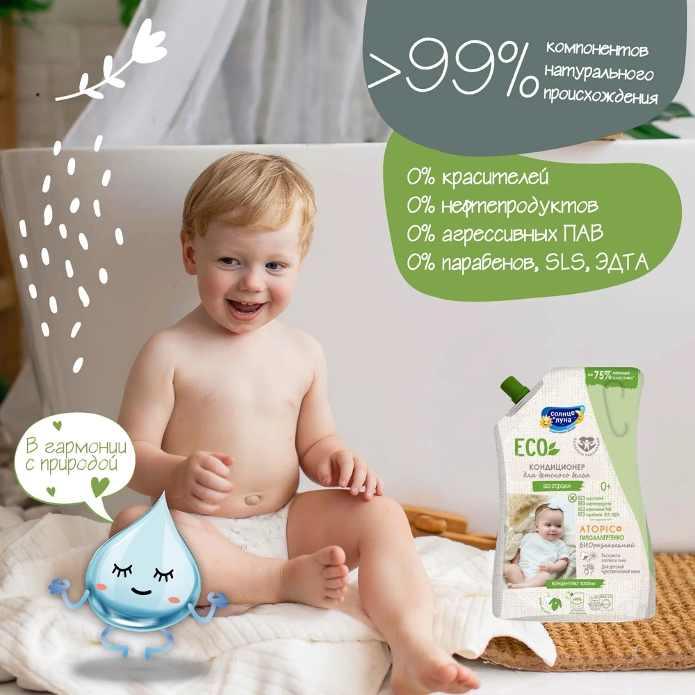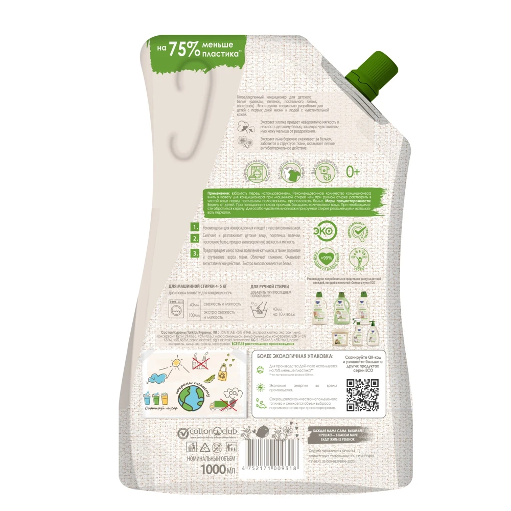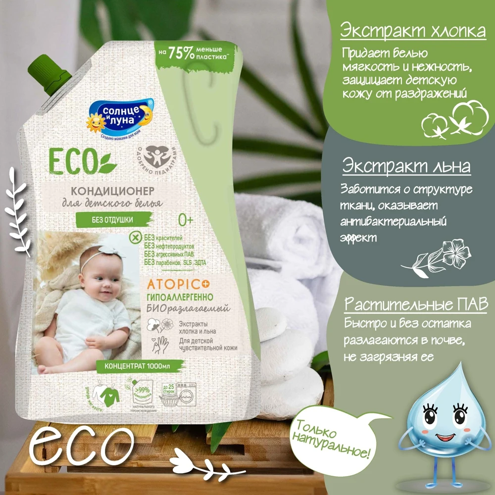Гипоаллергенный кондиционер для детского белья (одежды, пеленок, постельного белья, полотенец) без отдушки с экстрактами хлопка и льна специально разработан для детей с первых дней жизни и людей с чувствительной кожей.