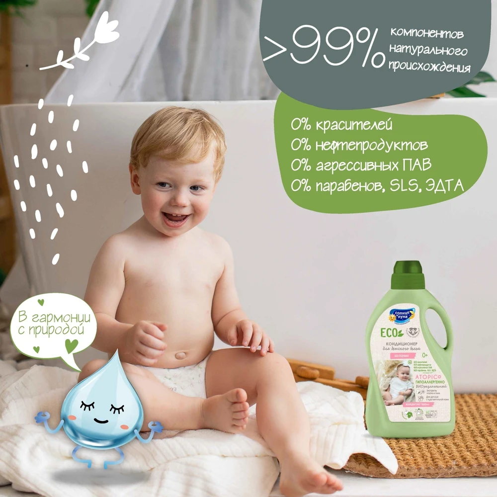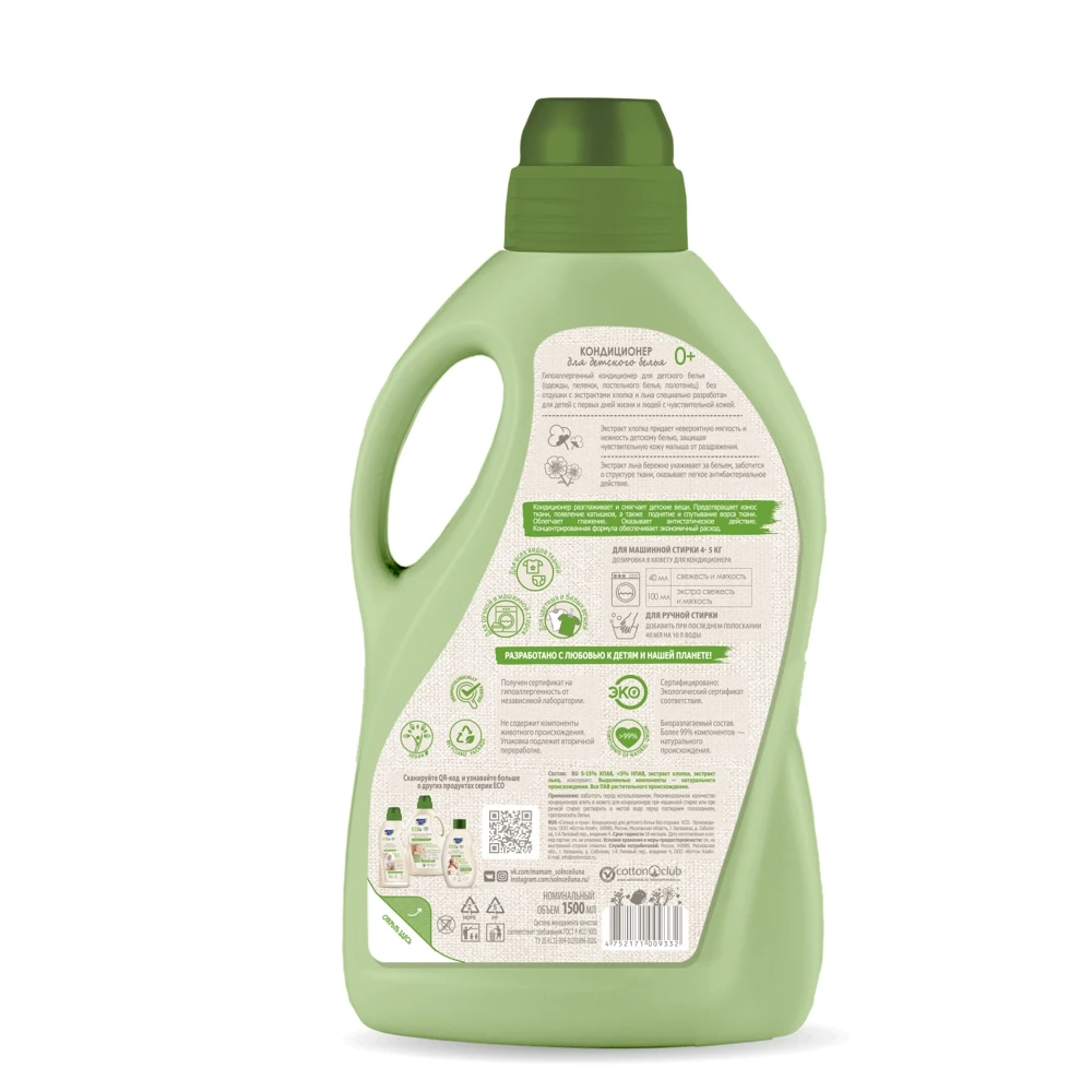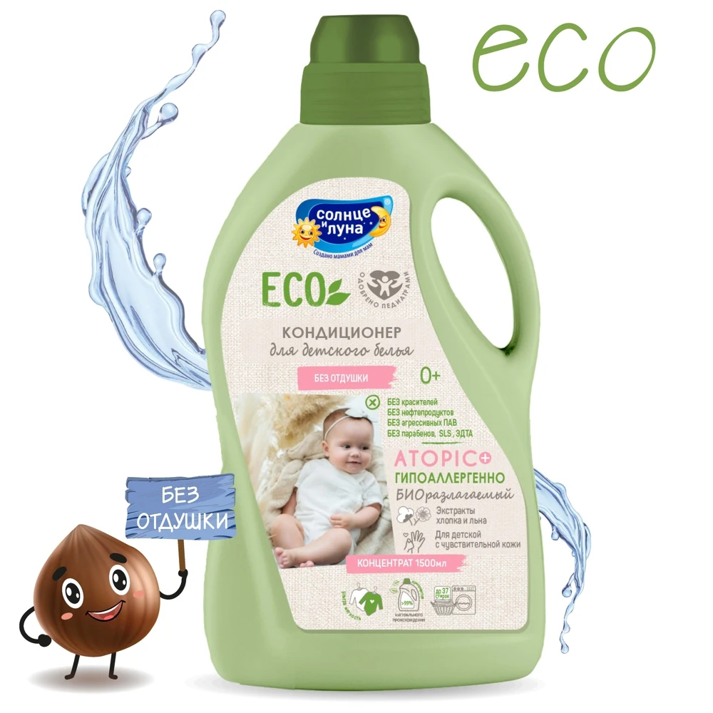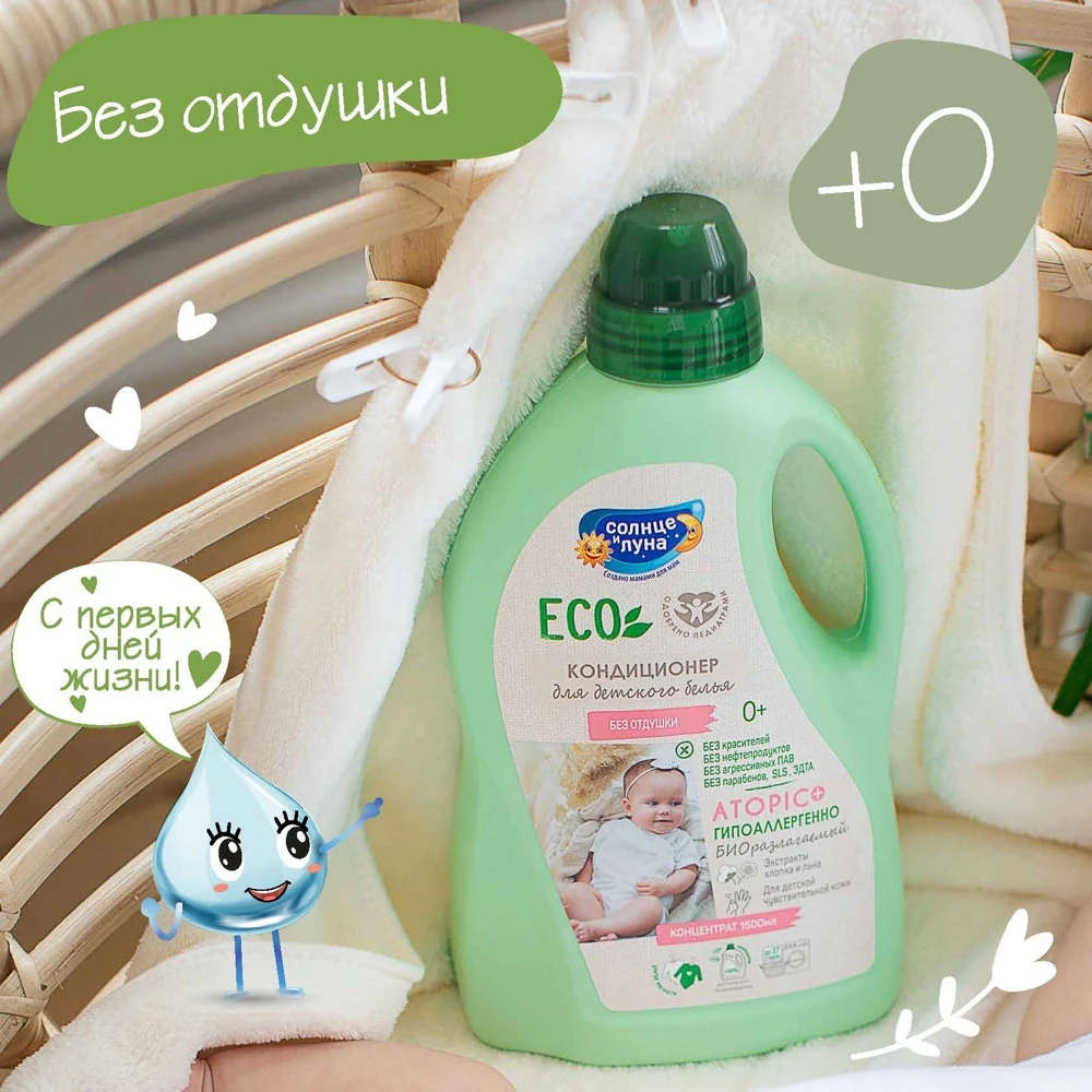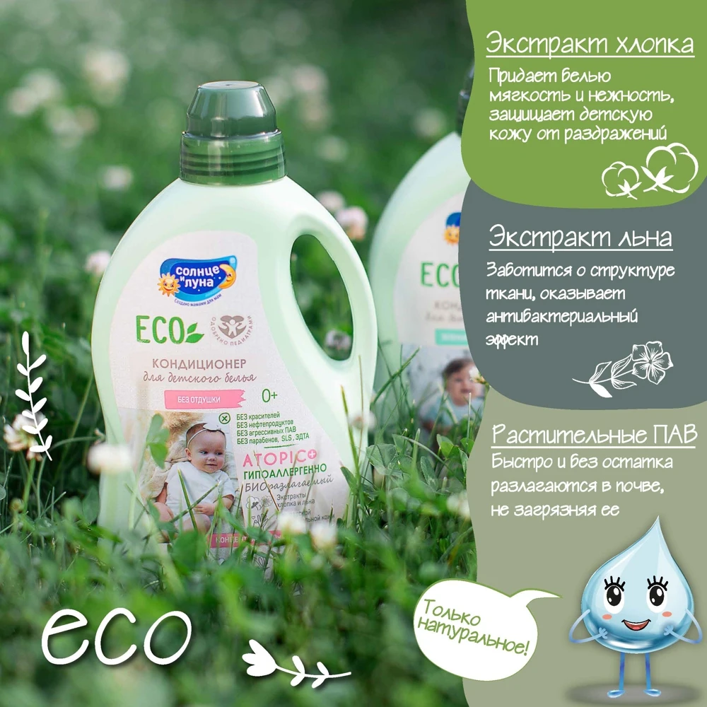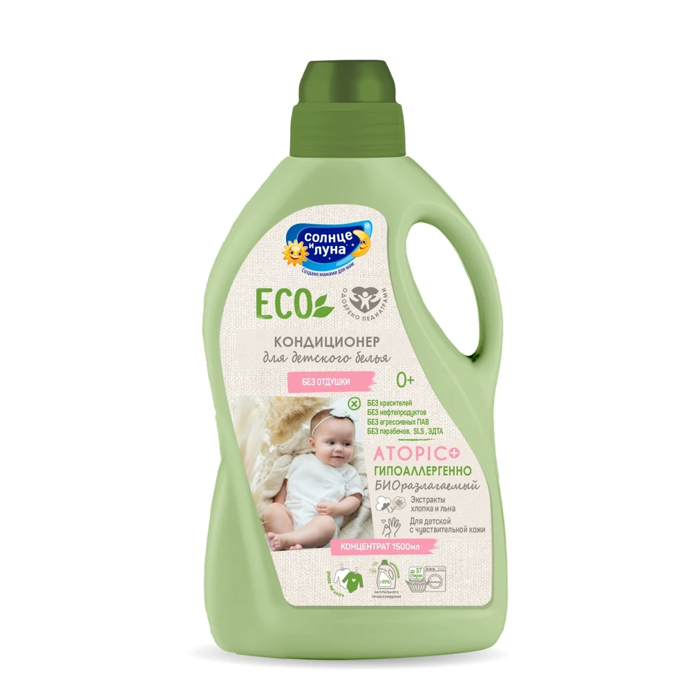 Гипоаллергенный кондиционер для детского белья (одежды, пеленок, постельного белья, полотенец) без отдушки с экстрактами хлопка и льна специально разработан для детей с первых дней жизни и людей с чувствительной кожей.