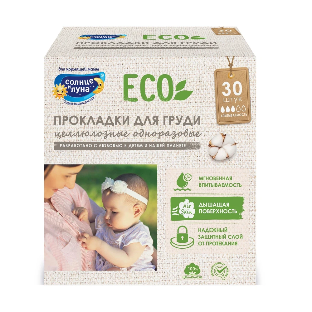 Целлюлозные прокладки на грудь Солнце и Луна. ECO идеально подходят для мамы в период умеренной лактации, когда молоко поступает в небольшом объеме.