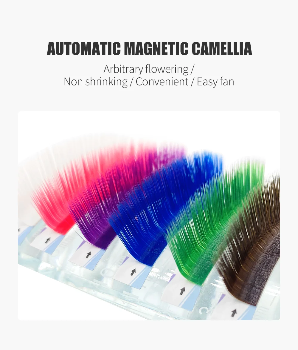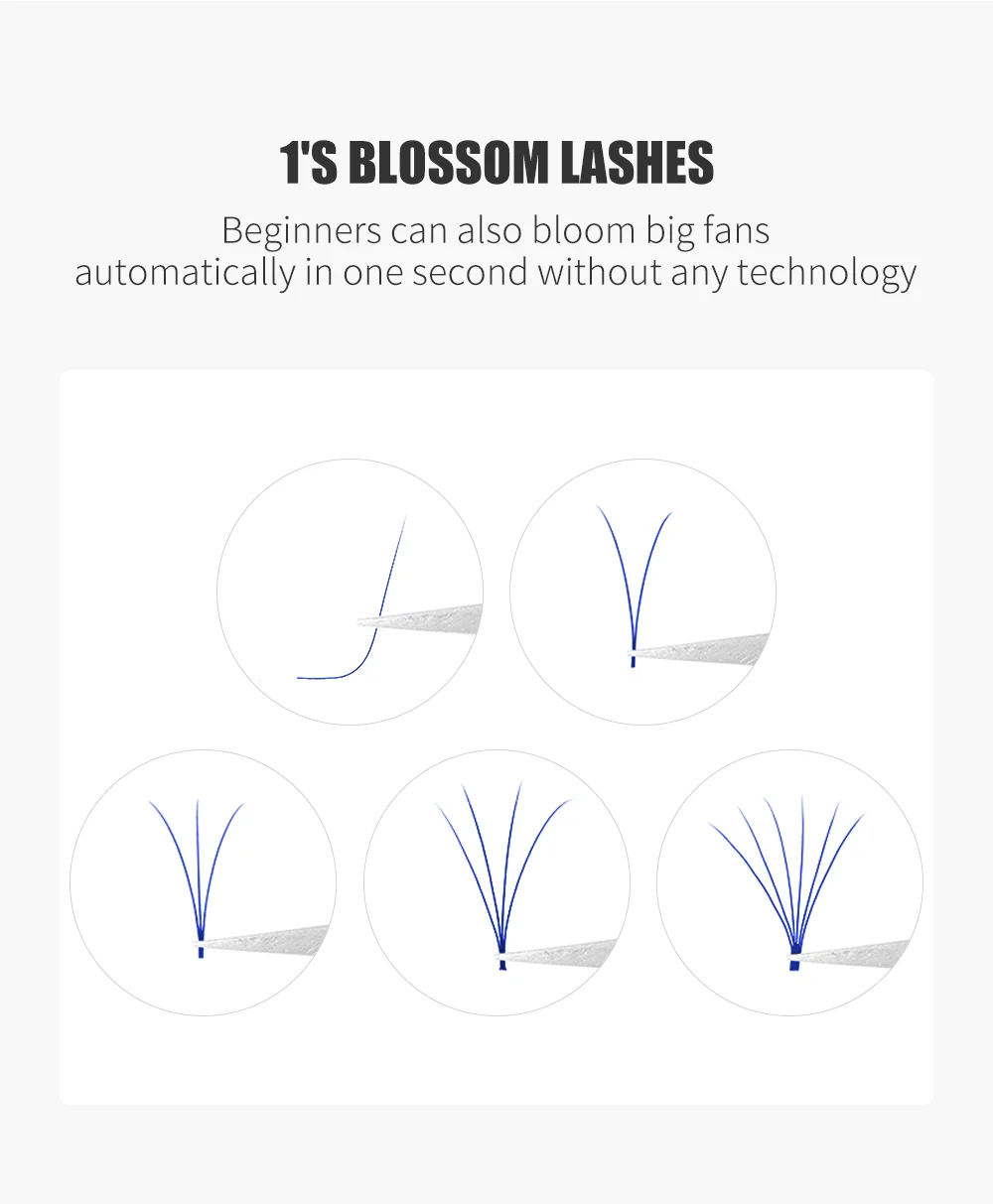 1. 1'S Blossom lashes также называется easy fan volume lashes и магнитной камелии, очень легко сделать поклонников без каких-либо технологий, и сделать процесс прививки более быстрым, что очень популярно среди многих косметологов.