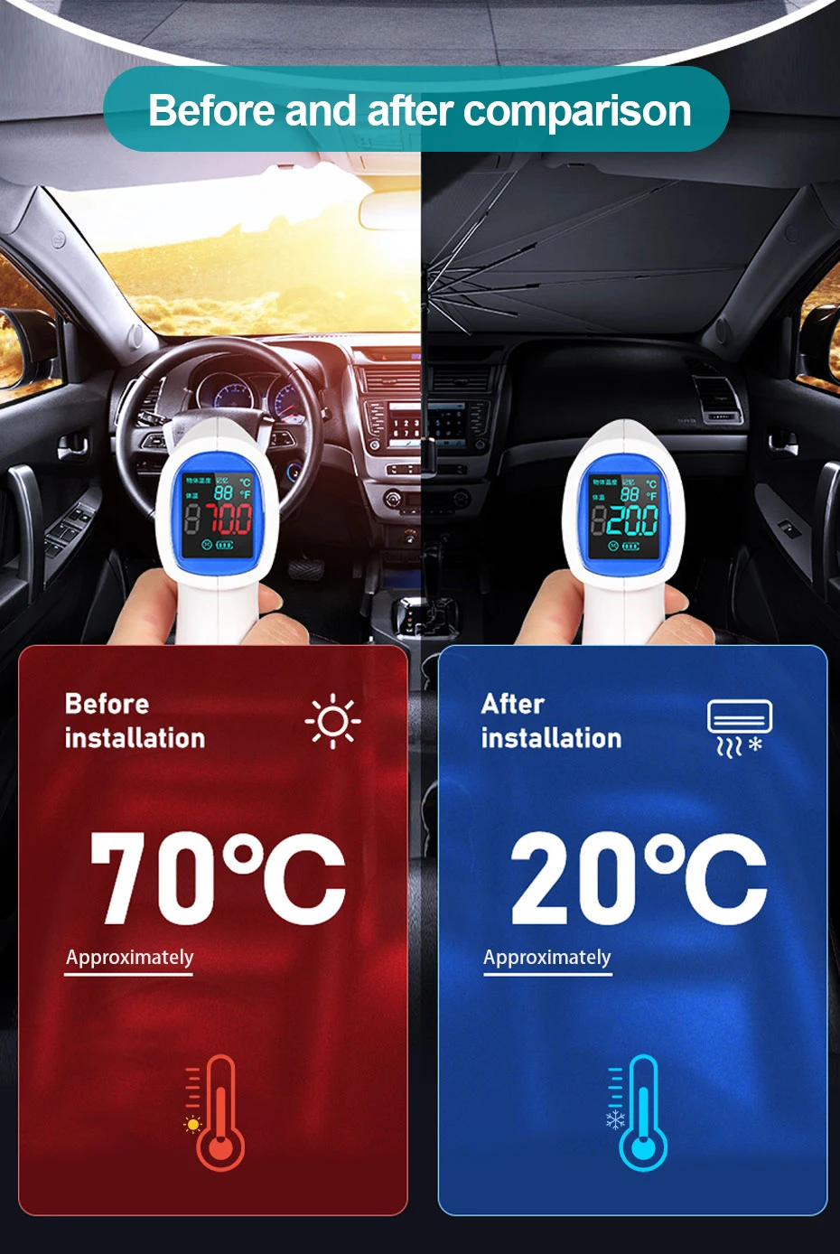 4. Независимо от того, что это весенний дождь, летнее солнце, осенние листья или зимний снег, зонт от солнца для автомобиля может использоваться во все сезоны с его высокой устойчивостью к погоде, как анти-снег, туман, УФ, тепло.