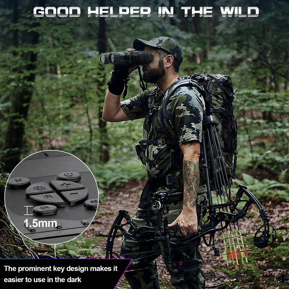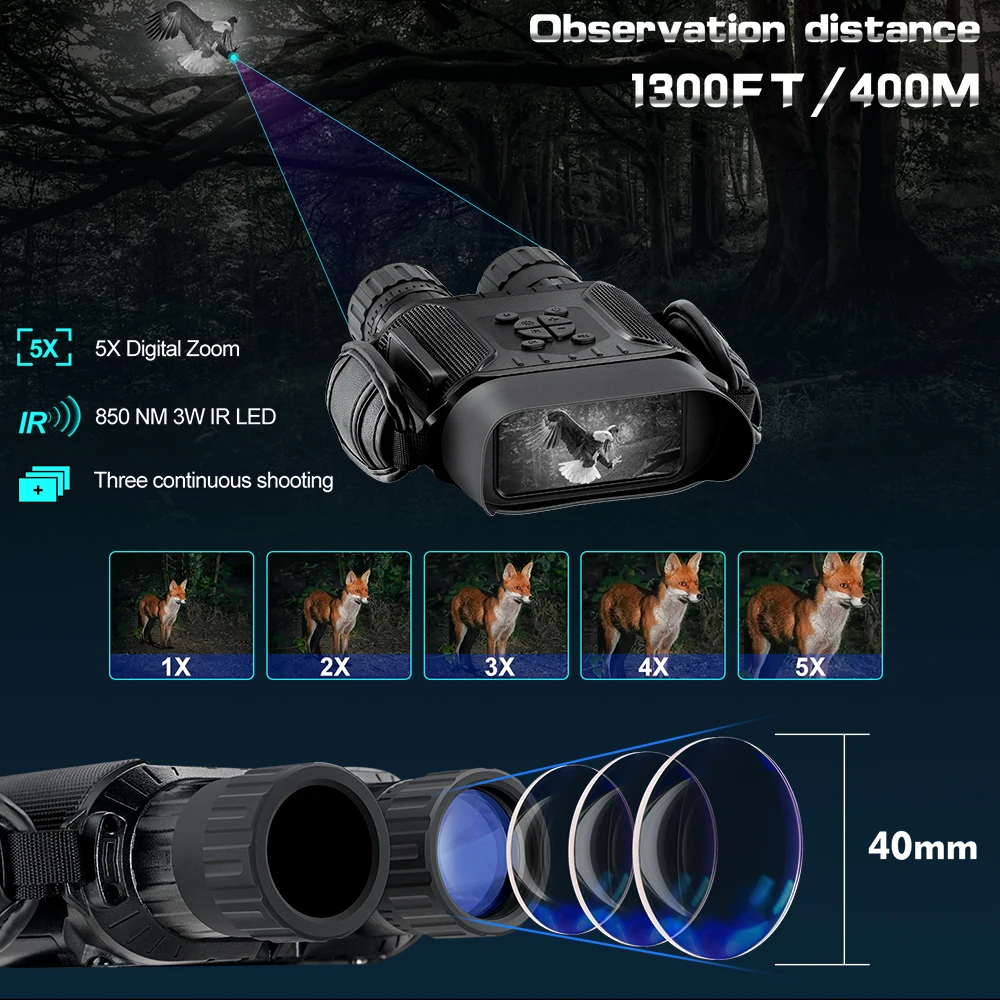 Подходит для охоты на различных животных и наблюдения за птицами, оленями, кроликами, мышами, кабанами, большой рыбой, листьями, предметами, людьми и т. д., дальность обзора 400 м в ночное время, дальность обзора 1000 м в дневное время.