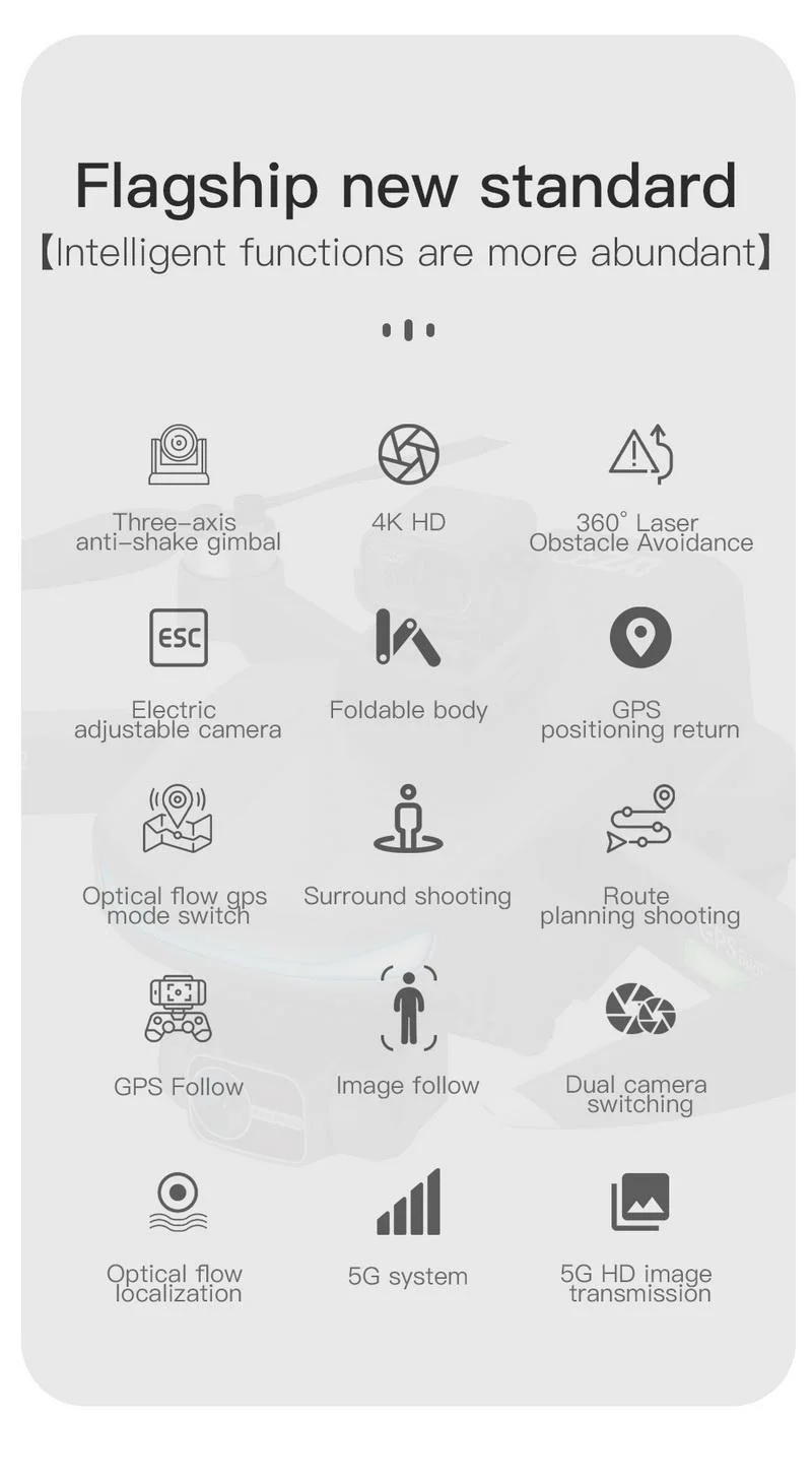 8. Регулируемая камера 4K (трехосевой механический стабилизатор + электронная стабилизация + Лазерное Предотвращение препятствий)