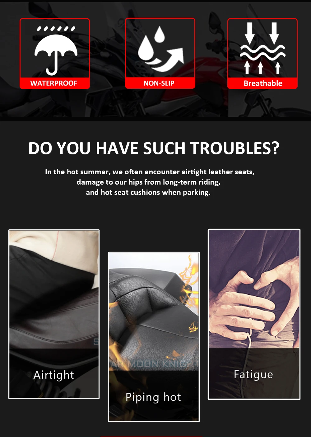 Этот чехол для сиденья-это кондиционер для вашего оригинального сиденья мотоцикла. Воздух может циркулировать во время вождения, потому что крышка трехмерная. Даже при большом весе, он не может быть полностью сжатым: это не только обеспечивает воздухопроницаемость, но и сохраняет ваши ягодицы сухими, когда идет дождь. Крутой чехол не нагревается даже при прямых солнечных лучах. Еще один плюс: это создает массажный эффект и тем самым уменьшает признаки усталости.